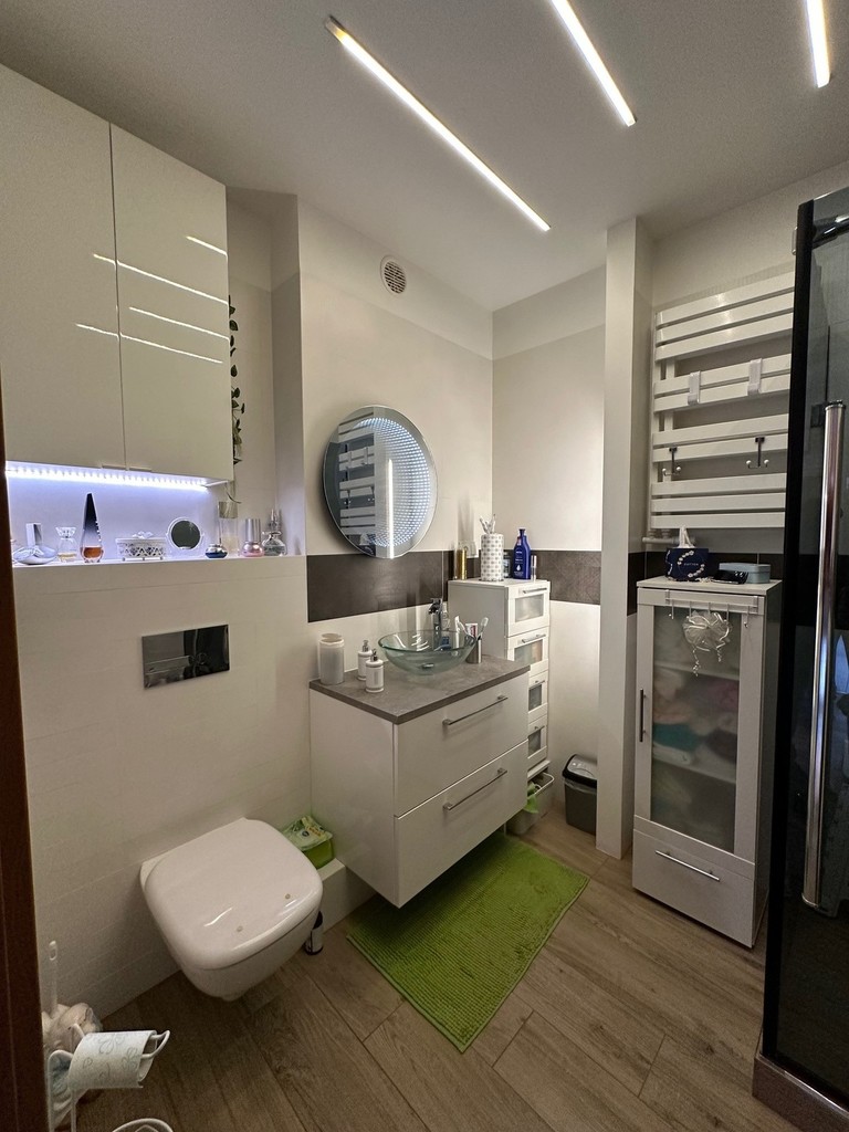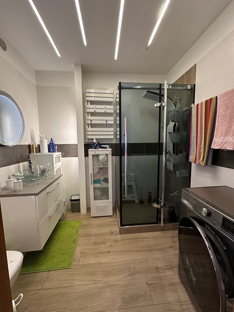 WC zostało połączone z łazienką i uzyskano ładną nowoczesną i przestronną przestrzeń, w której znalazł się prysznic z kaskadą, deszczownicą i masażami., muszla, umywalka, pralka oraz sporo powierzchni do przechowywania.