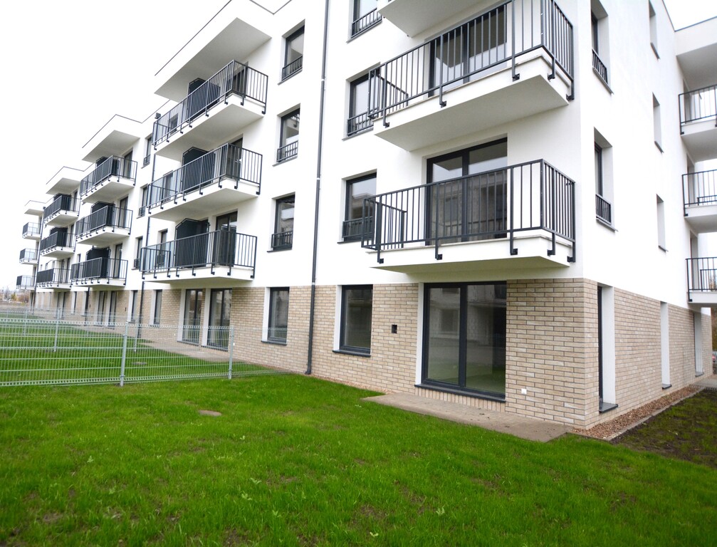 Nowoczesna architektura, kompleksowo zagospodarowany teren osiedla, chodniki, niskie nasadzenia, plac zabaw dla najmłodszych.