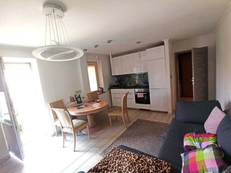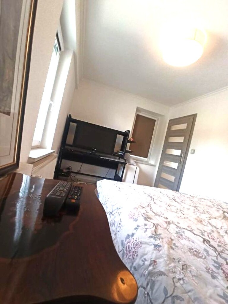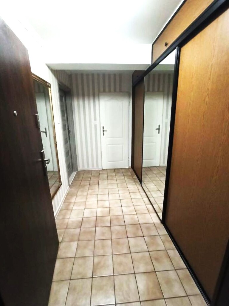 Na powierzchni ok 44m2 znajduje się: duży salon z aneksem kuchennym z którego jest wyjście na obszerny balkon ciągnący się przez długość mieszkania, sypialnia, przedpokój z szafą typu komandor oraz łazienka z wc. Na podlodze w całym mieszkaniu położono terakotę, ściany malowane, okna PCV, 3 szybowe, z zewnętrznymi żaluzjami automatycznymi i wewnętrznymi roletami.