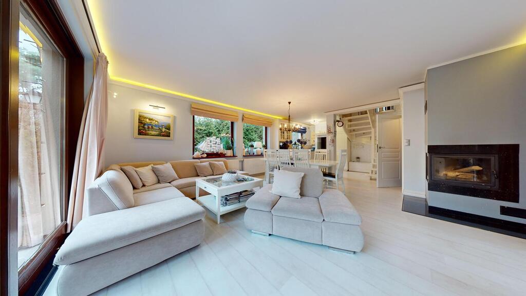 -Salon z kominkiem i aneksem kuchennym z dużymi oknami antywłamaniowymi wychodzącymi na zieleń ogrodu