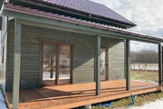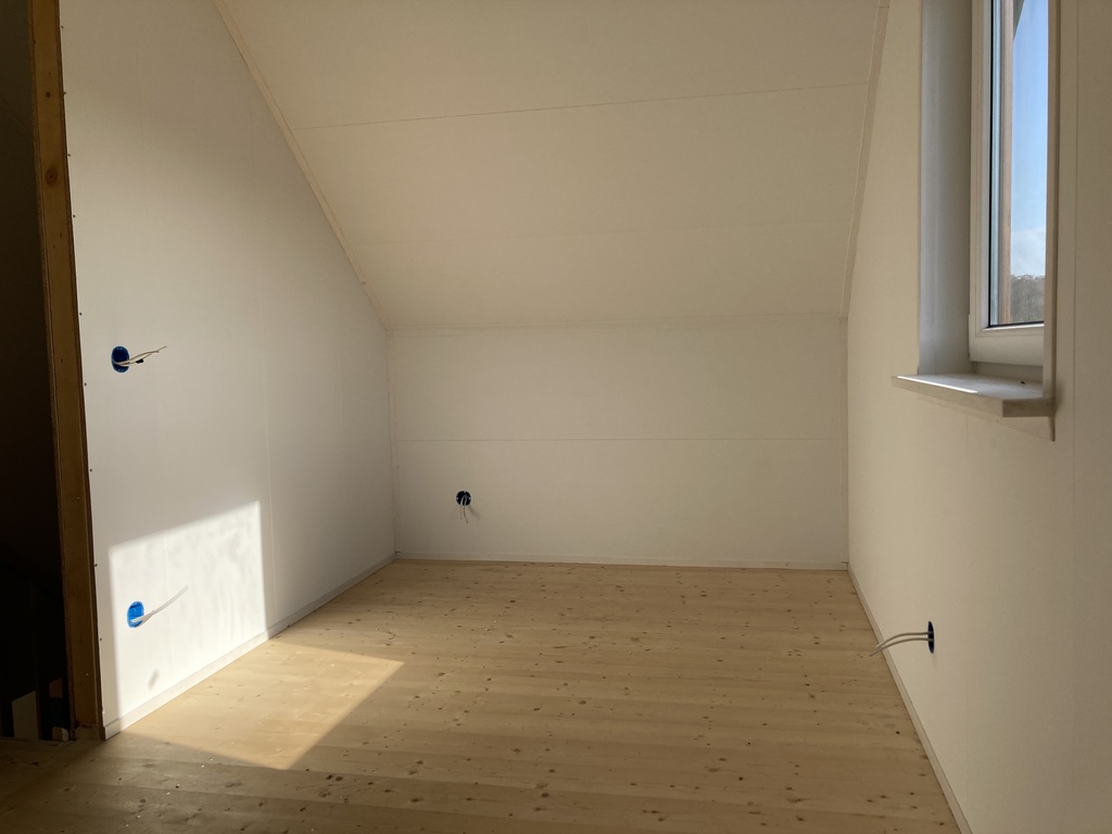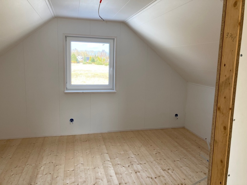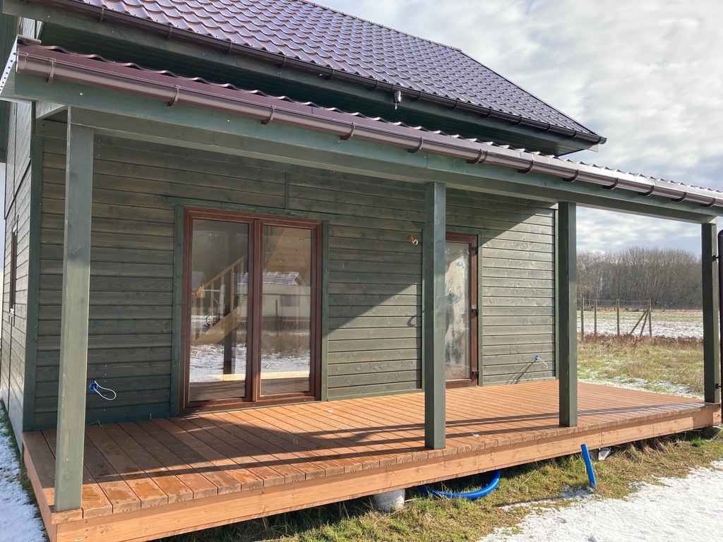Na działce postawiono dom parterowy z poddaszem użytkowym w technologii drewnianej z dachem dwuspadowym, z pergolą od południowego zachodu.