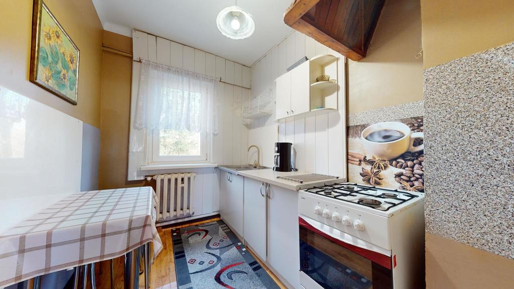 Kuchnia w funkcjonalnej zabudowie w pełni wyposażona w sprzęt AGD.