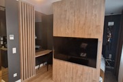 Nowocześnie urządzone, starannie wykończone mieszkanie z aneksem kuchennym, wydzielonym miejscem sypialnianym.
