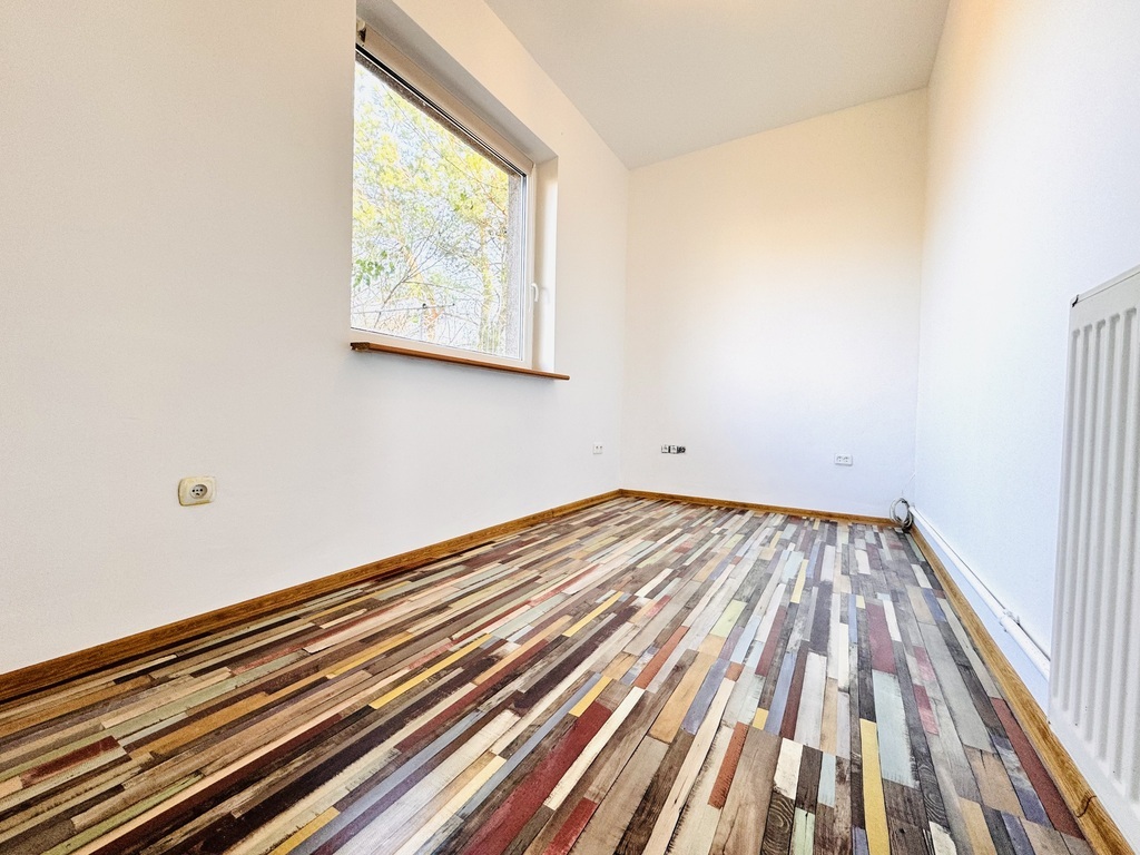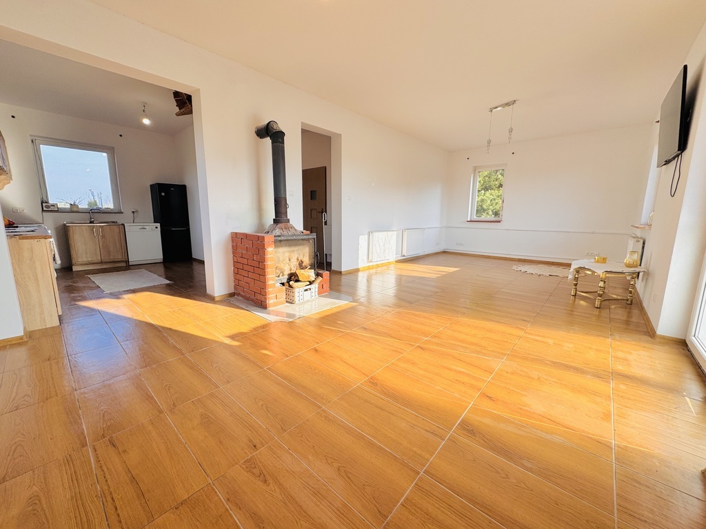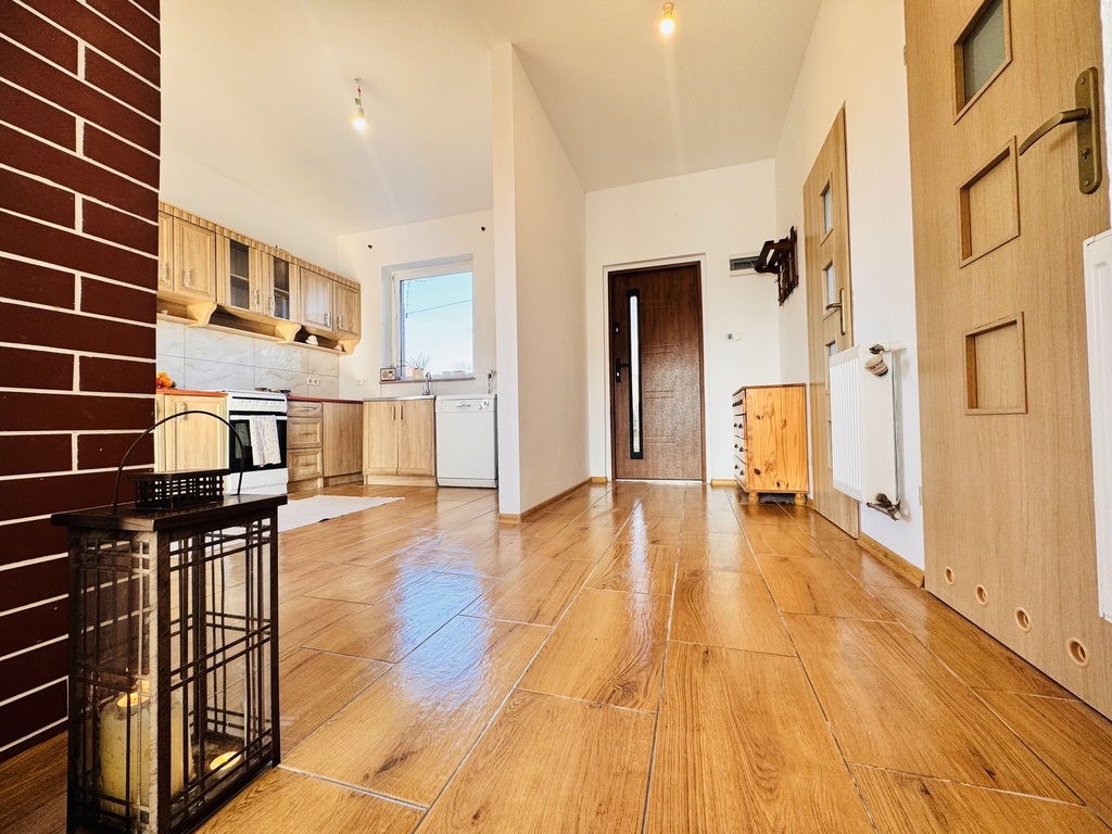 Ściany wszędzie gładzone, malowane. Na podłogach panele i płytki. Okna PCV.