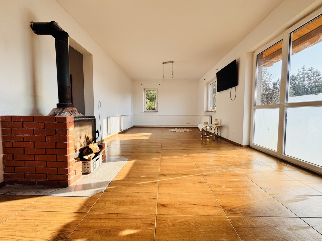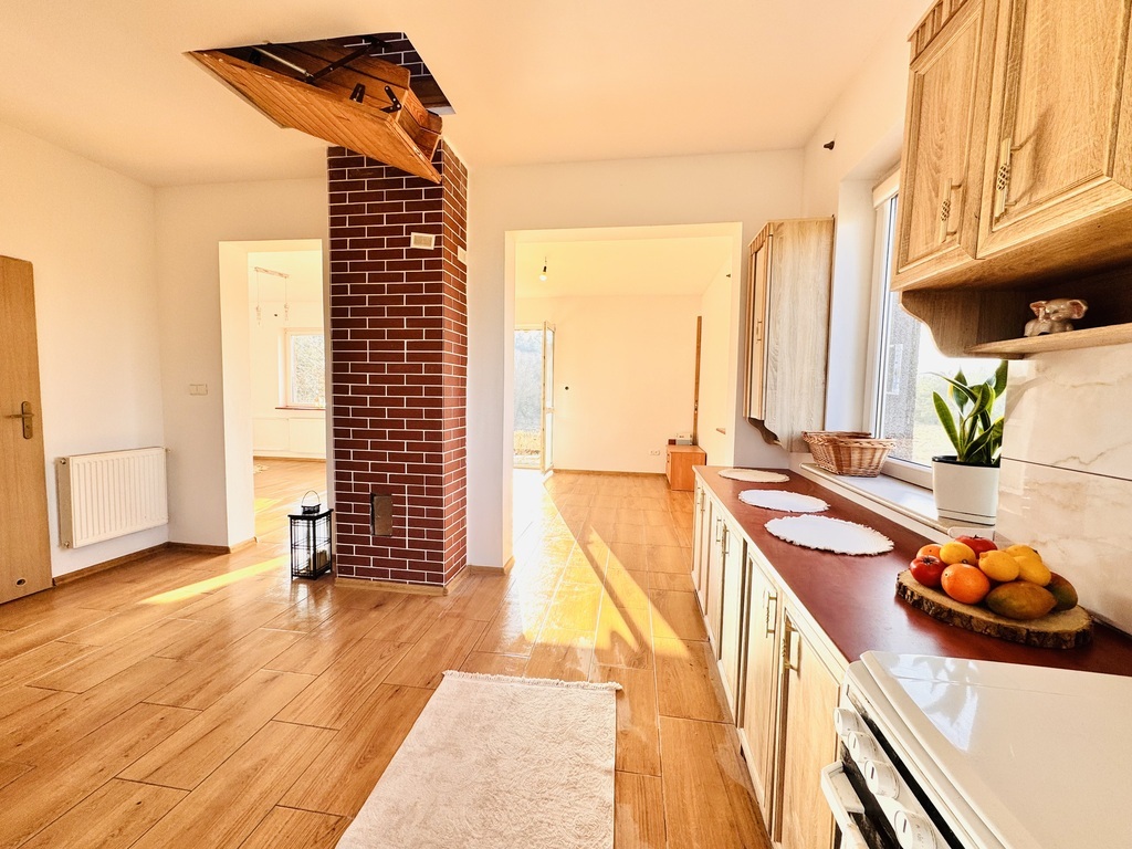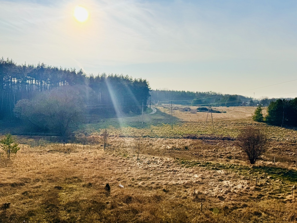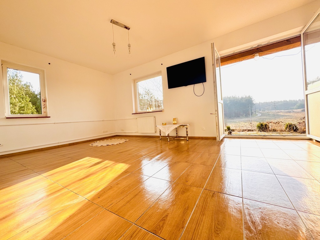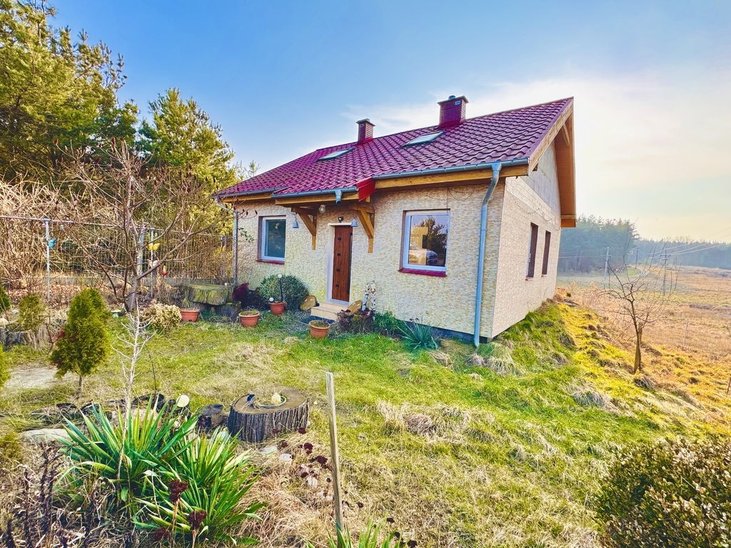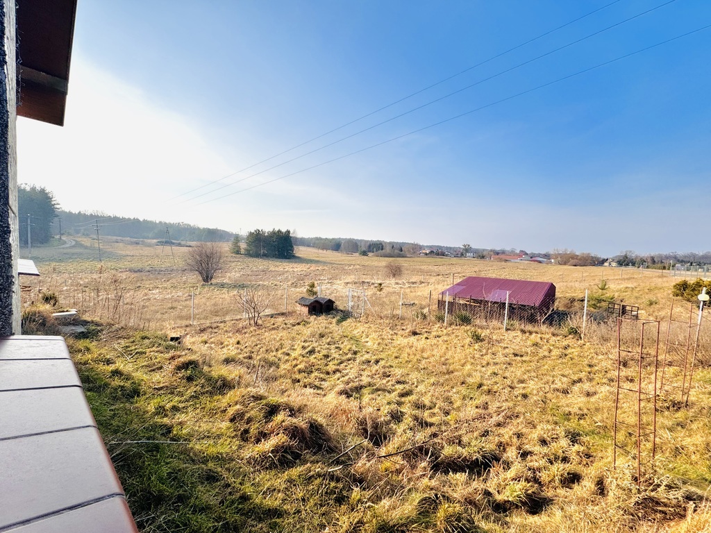 Dom cudownie posadowiony na niewielkim wzgórzu z widokiem na pola i lasy.