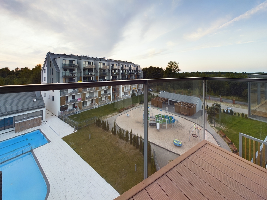 –Balkon tarasowy typu loggia: Imponujący, duży taras z widokiem na morze, basen oraz plac zabaw – idealne miejsce na poranną kawę lub wieczorne chwile relaksu.