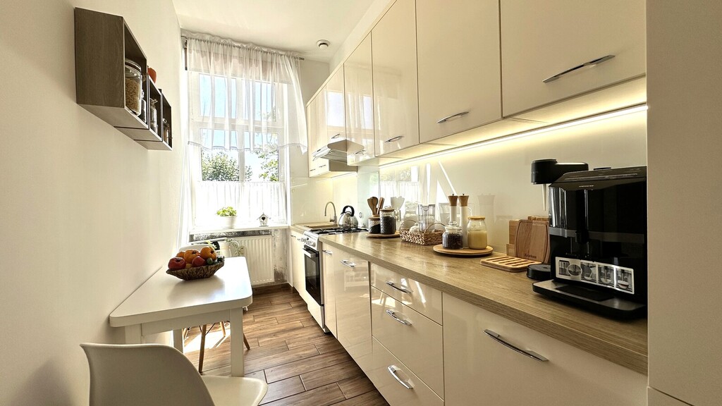 Mieszkanie jest bardzo zadbane, słoneczne, ładnie urządzone, ciche, sąsiedzi są spokojni, miejsce zacisznie a wokół zieleń. W pobliżu sklep Lidl, apteka, sklep Społem, piekarnia, osiedlowy warzywniak, przystanki autobusowe nr 58, 59, 99, tramwaj nr 6, parę metrów do rzeki Odra a ok. 800 mkw. od domu taras widokowy oraz plac zabaw (urokliwe miejsce wypoczynkowe). Niedaleko do szpitala na Strzałkowskiej, do przychodni, szkoły na ul. Hożej.