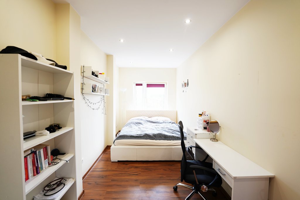 Ściany malowane w stonowanym kolorze, na podłogach położone panele.