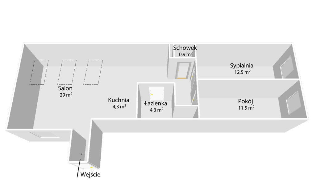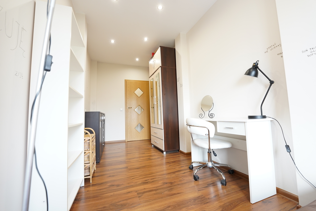 Mieszkanie jest bardzo dobrze dobrze doświetlone – duże okna PCV w pokojach oraz dodatkowe okna połaciowe w salonie rozświetlają