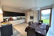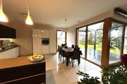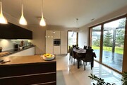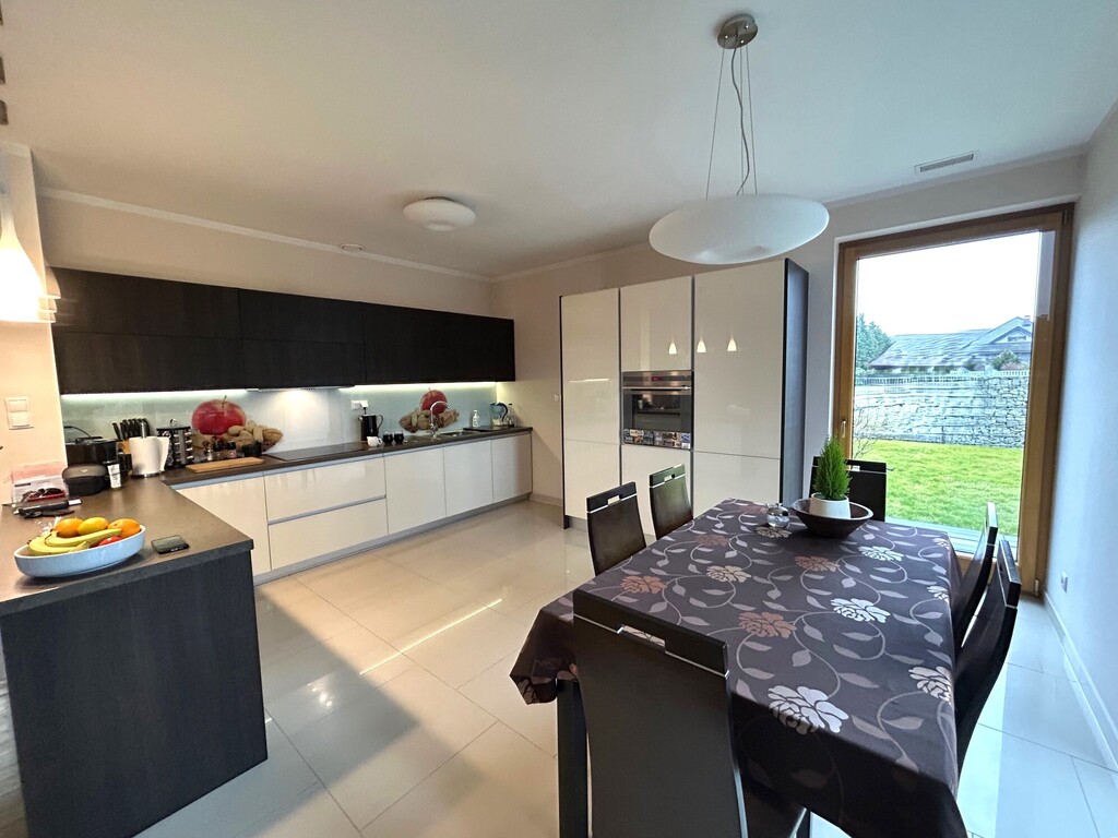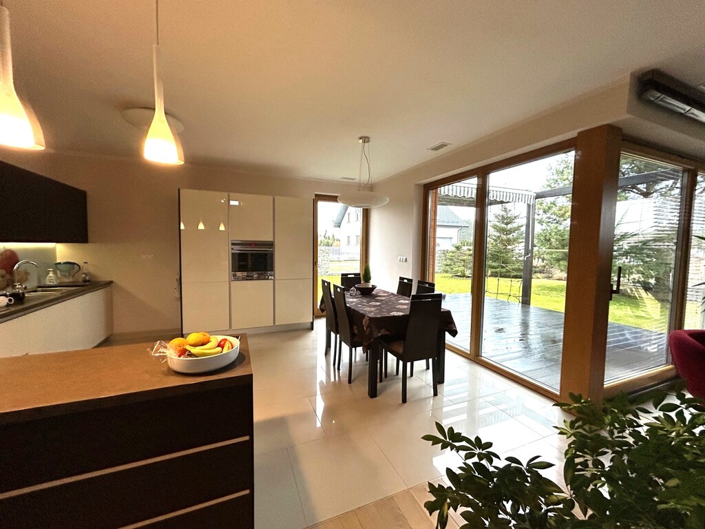 – „otwarta”, w pełni wyposażona (zmywarka, lodówka z zamrażarką, płyta grzewcza – indukcja, pochłaniacz, piekarnik) kuchnio – jadalnia (ponad 18 m2), z jadalni wychodzimy na taras (ok. 13,5 m2, strona południowo – zachodnia), a z niego do ogrodu,