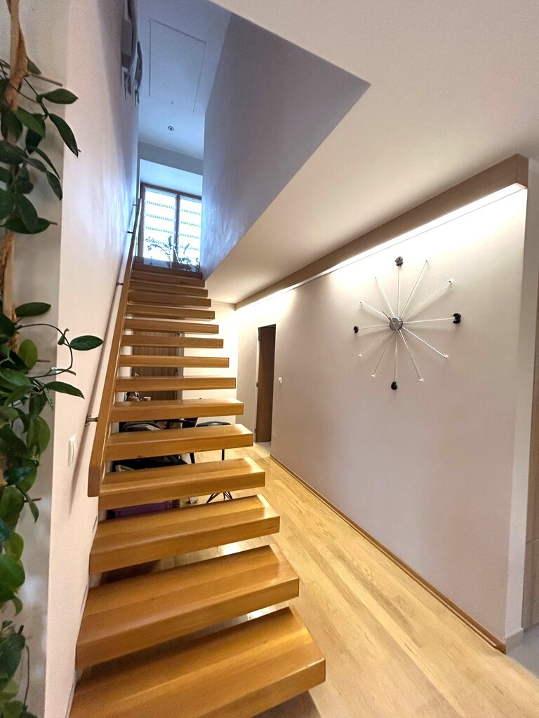 Podłogi: lity dąb, gres, terakota. Ogrzewanie – piec gazowy firmy Buderus z zasobnikiem na 300 litrów, ogrzewanie nawiewowe (w domu nie ma kaloryferów), panele solarne. W łazienkach ogrzewanie podłogowe.