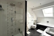 – duża łazienka z oknem (wanna, kabina prysznicowa, dwie umywalki)
