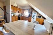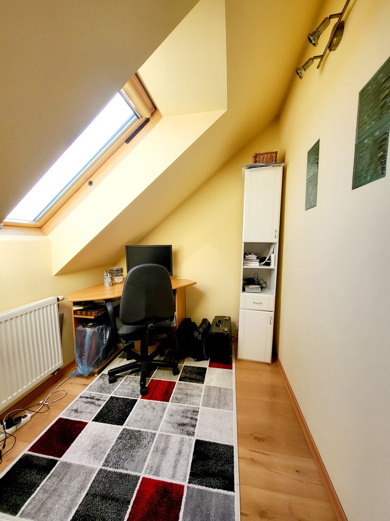 I piętro składa się z salonu z wyjściem na taras od strony zachodniej, aneksu kuchennego, łazienki z wc, w której znajduje się piec gazowy, przedpokoju, sypialni z przejściem do mniejszego pokoju, który pełni funkcję biura.