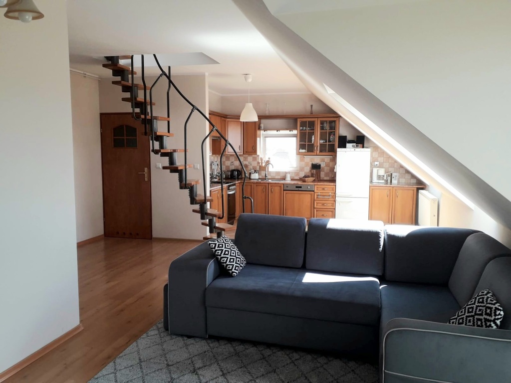 Obecnie klatka schodowa prowadząca do mieszkania jest zabudowana od 1.5 piętra dzięki czemu zyskujemy dodatkową przestrzeń.