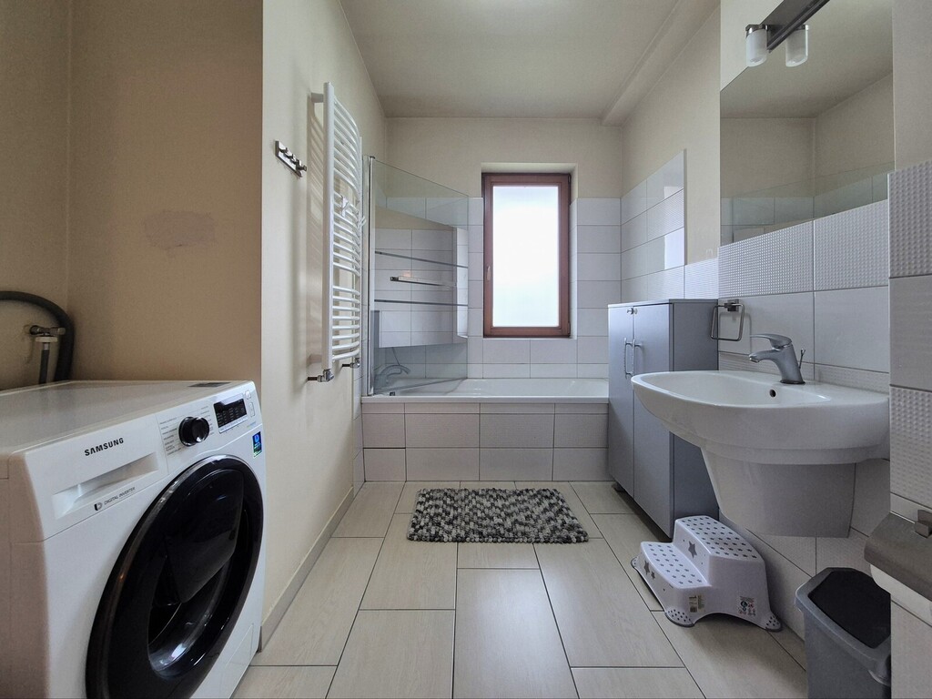 *łazienka z wanną, umywalką, wc i pralką o pow. 6.4 m2,