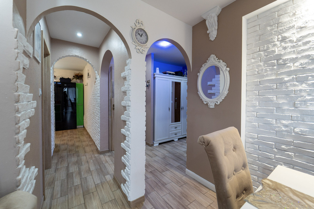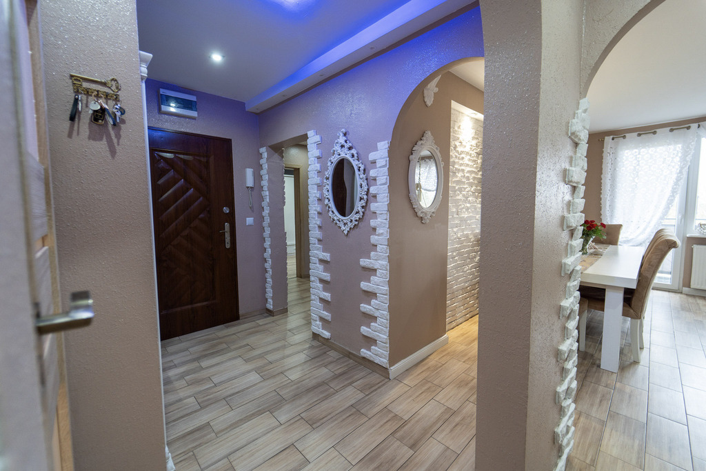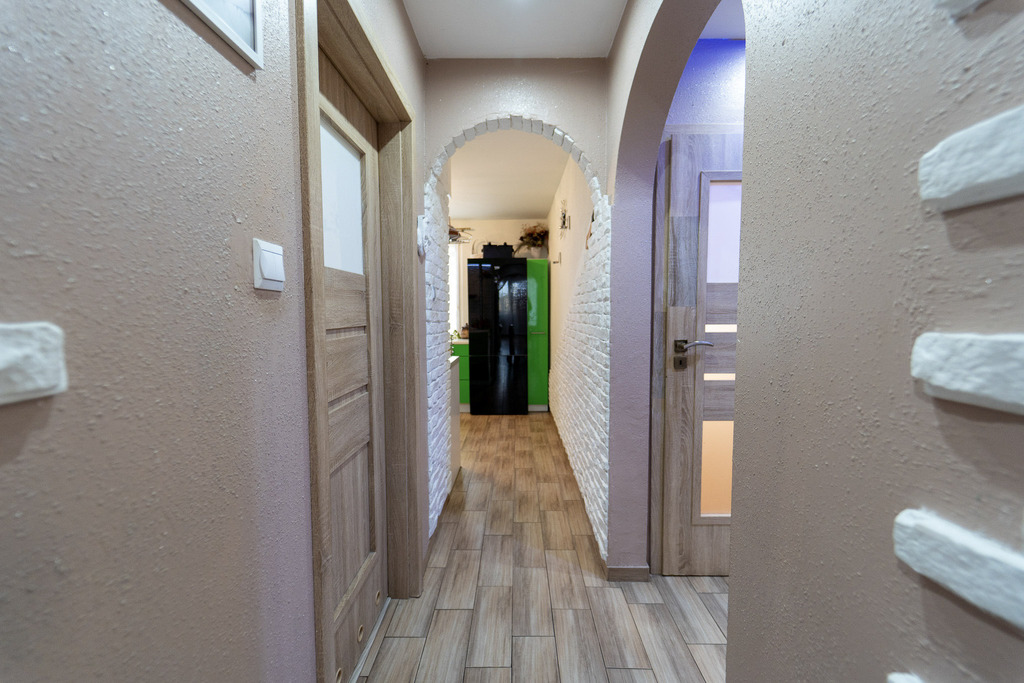Mieszkanie powstało z połączenia 2 oddzielnych mieszkań , 3 pokojowego o powierzchni użytkowej 52,60 m2 oraz 1 pokojowej kawalerki o powierzchni użytkowej 29,27 m2. Podczas połączenia lokali w jedną całość zachowane zostały wszystkie niezbędne elementy umożliwiające ponowny powrót do stanu pierwotnego włącznie z dwoma oddzielnymi wejściami.