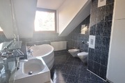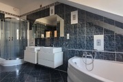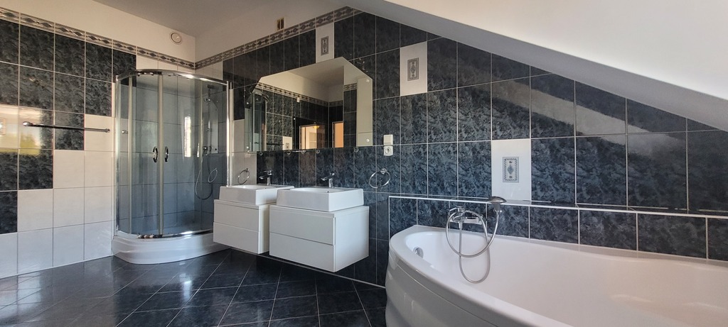 – duża łazienka z oknem (wanna, kabina prysznicowa, dwie umywalki, bidet i wc),