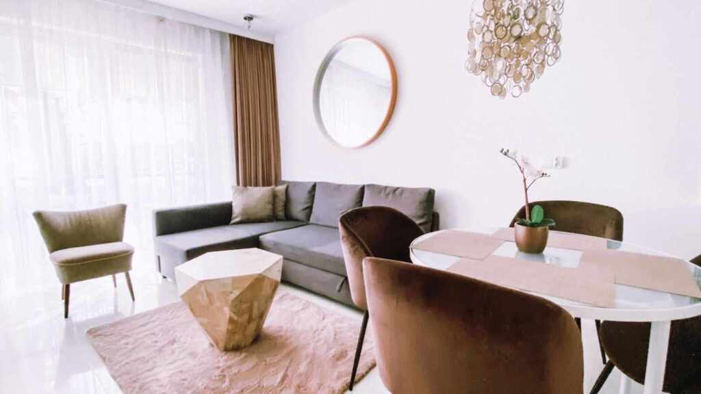 W apartamencie zastosowano wysokiej jakości materiały wykończeniowe – w salonie i łazience położono białą glazurę, natomiast w sypialni podłogę drewnianą. Mieszkanie jest w pełni umeblowane i wyposażone, co czyni je gotowym do zamieszkania lub natychmiastowego wynajmu.