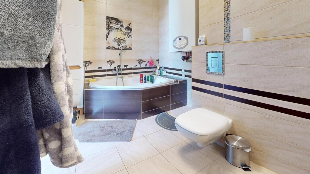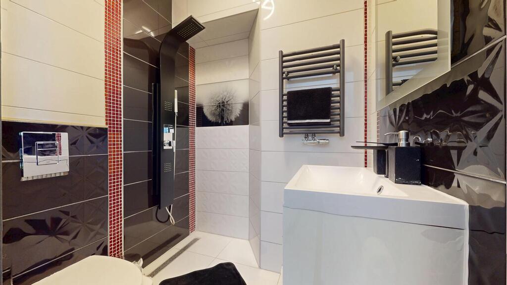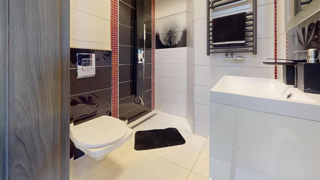 – łazienki z WC wyposażonej w bez brodzikową kabinę prysznicową.