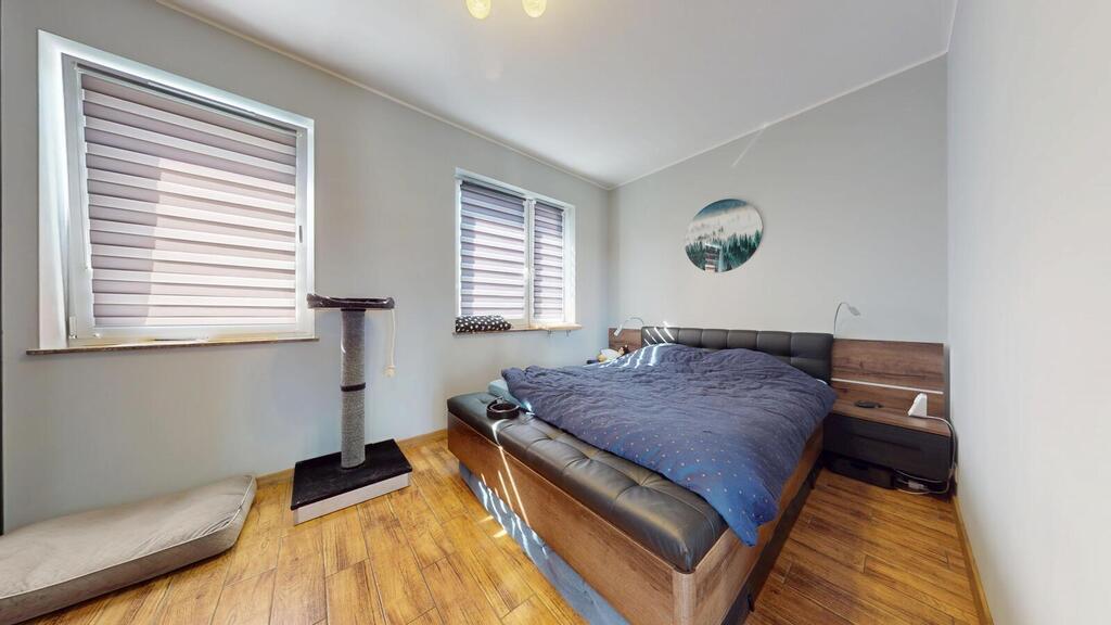 Ściany we wszystkich pokojach gładkie – malowane. Podłogi w pomieszczeniach na parterze  jak i na piętrze wykonano z gresu imitującego panel podłogowy. Łazienki w wykończone ładną glazurą i terakotą.  Okna w domu trzyszybowe wykonane z PCV.