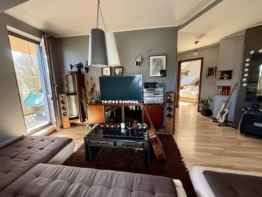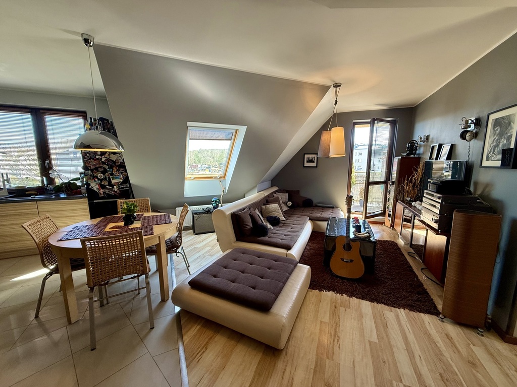 – salon z aneksem kuchennym, jadalnią oraz wyjściem na balkon,