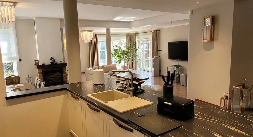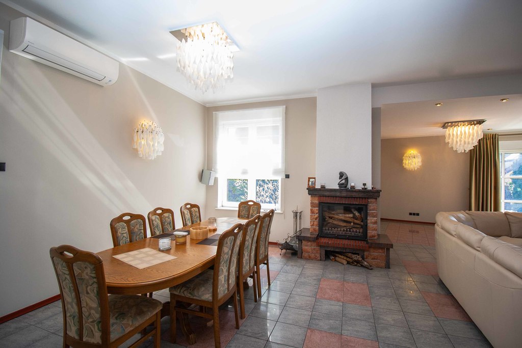 • Przestronna, otwarta strefa dzienna: salon z kominkiem, kuchnia z jadalnią (82,93 m²) i wyjściem na ogród,