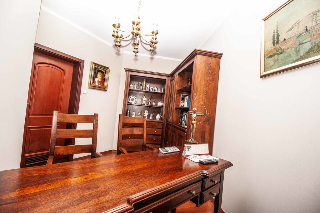 Dom został zaprojektowany i wykończony z pomocą architekta przy użyciu najwyższej jakości materiałów. Wnętrza urządzono ze smakiem i dużą dbałością o detale – oświetlenie, armatura łazienkowa oraz elementy dekoracyjne zostały sprowadzone z Hiszpanii, Włoch i Niemiec. Zasłony wykonane są z jedwabiu, a całe widoczne na zdjęciach wyposażenie może pozostać w cenie nieruchomości.