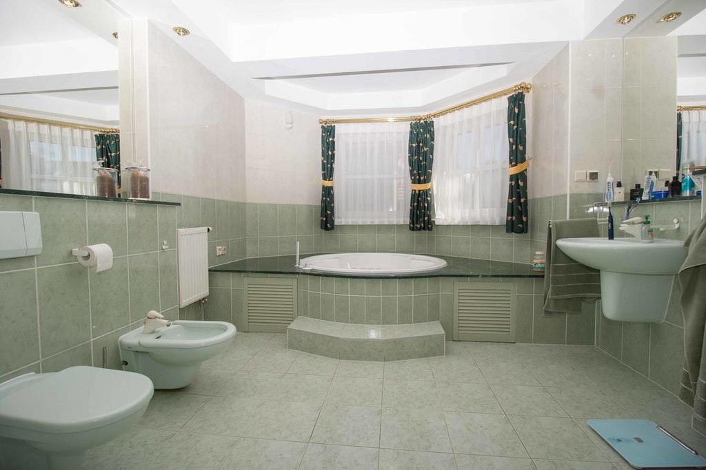 • Komfortowa łazienka z wanną z hydromasażem, dwiema umywalkami, glazurą i terakotą (10,54 m²).