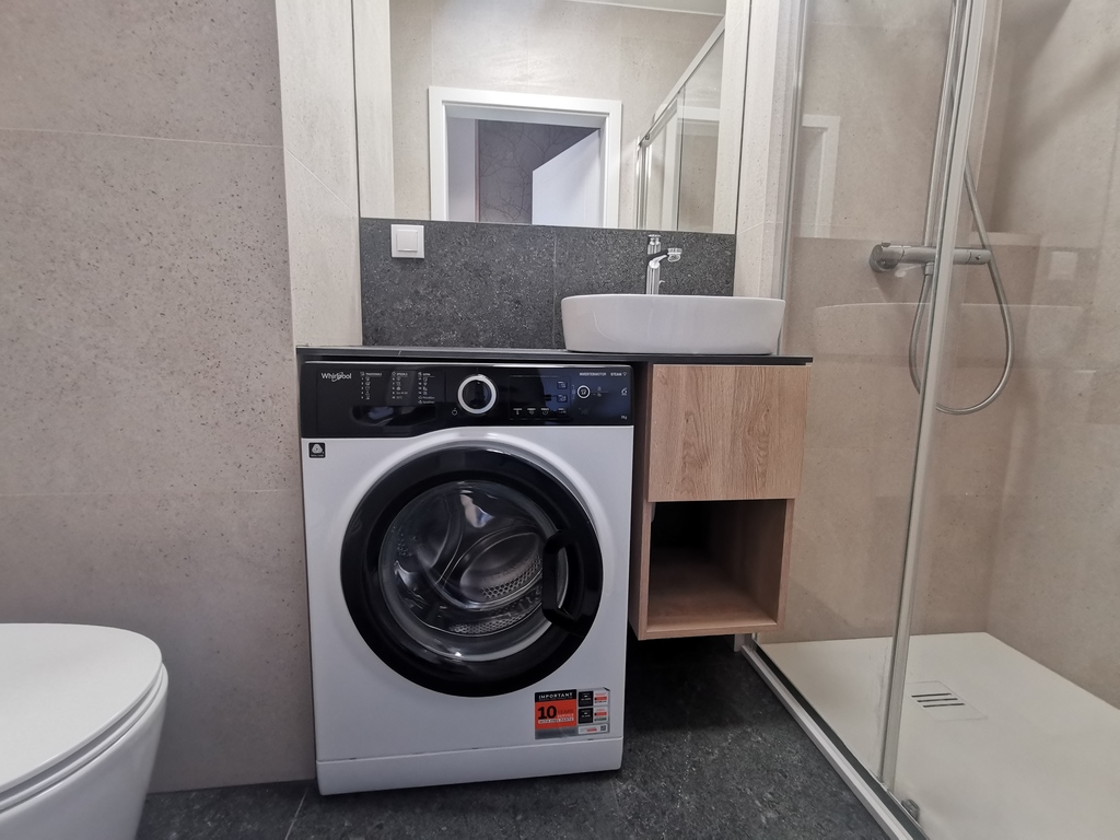 W łazience pralka, kabina prysznicowa, toaleta, umywalka.