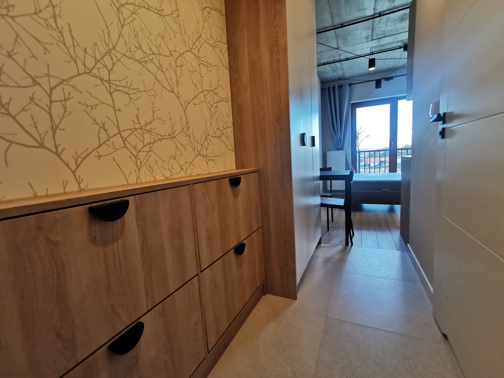 W części komunikacyjnej znajdziemy szafę na odzież oraz szafkę na buty.
