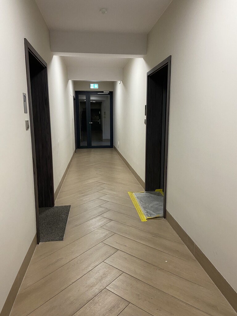 - Wewnętrzny korytarz z trzema mieszkaniami oddzielony drzwiami
