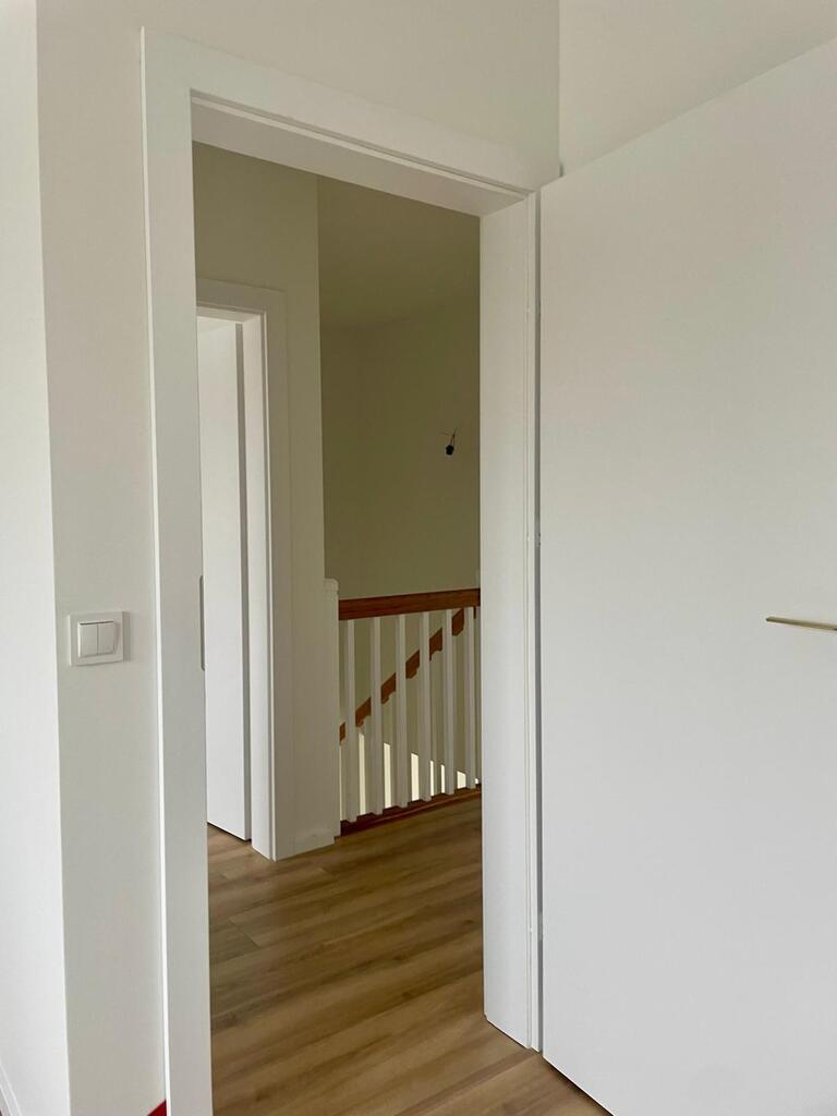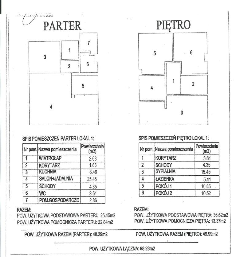 Piętro: korytarz ( 3,61m2 ), sypialnia ( 15,45 m2 ), dwa pokoje ( 10,65 i 10,52 m2 ), widna łazienka z WC ( 5,41 m2, wanna ). Wejście rozkładanymi schodami do pomieszczenie gospodarczego. Na podłogach panele.