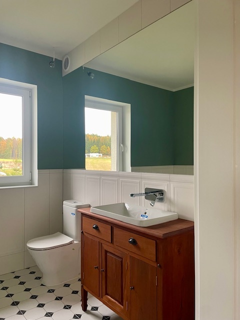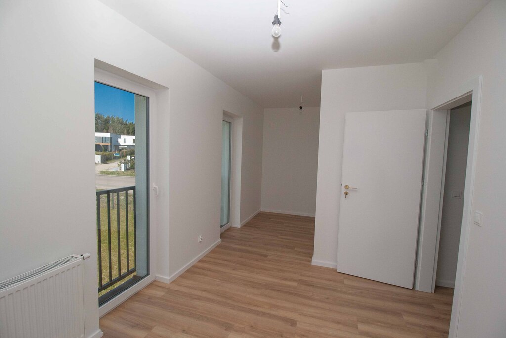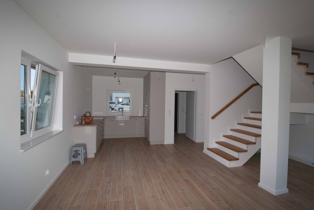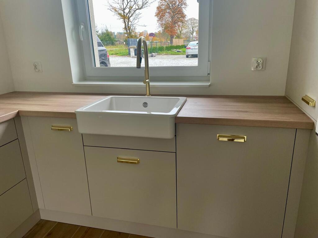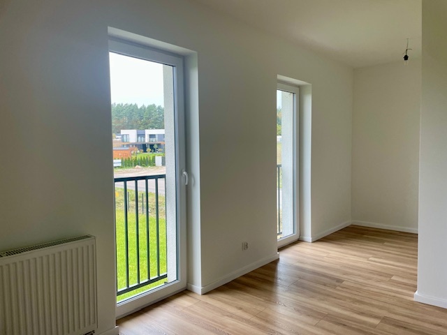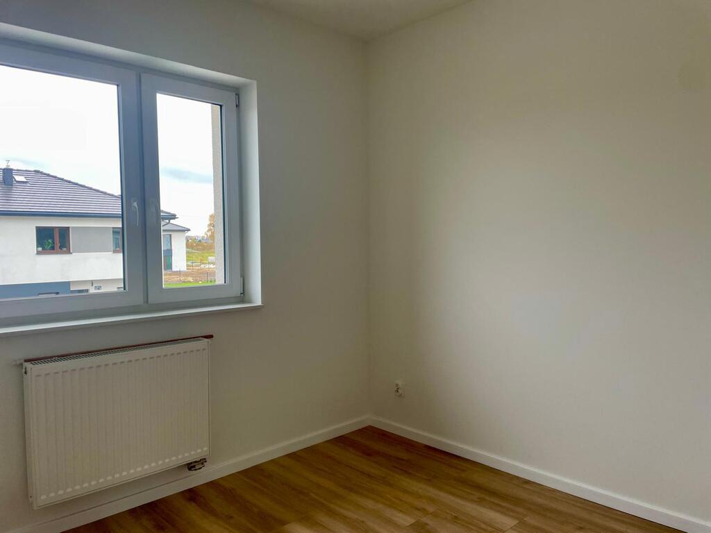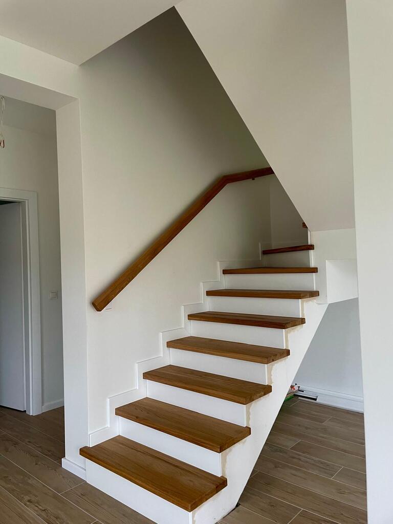 Parter: wiatrołap ( 2,68 m2 ), korytarz ( 1,88 m2 ), pomieszczenie gospodarcze ( 2,86m2 ), łazienka ( 2,61 m2 ,prysznic, wc ), salon z jadalnią ( 25,45 m2 ), aneks kuchenny ( 8,46 m2 ). Na pierwszym poziomie ogrzewanie podłogowe. Z salonu wyjście na taras i dalej na ogród. Na piętro prowadzą dębowe schody. Na podłogach płytki imitujące drewno.