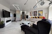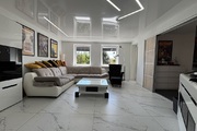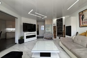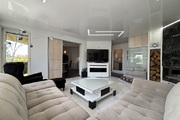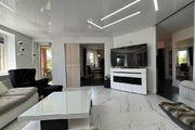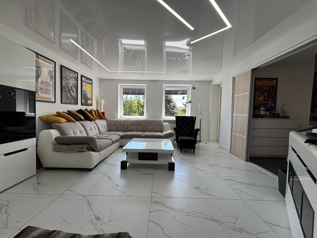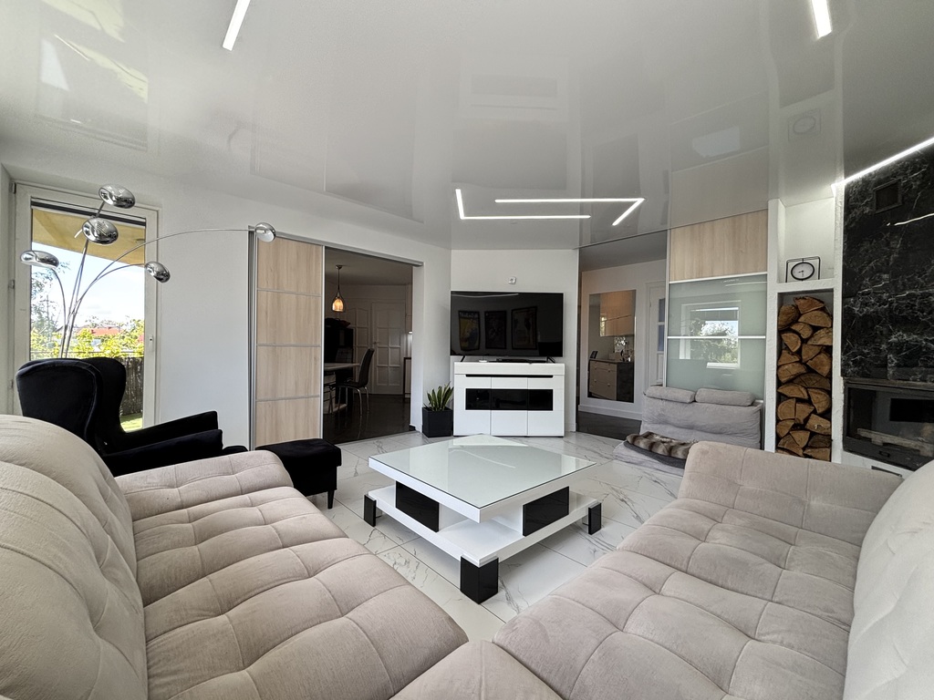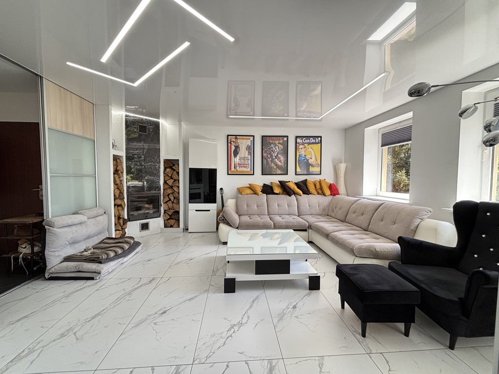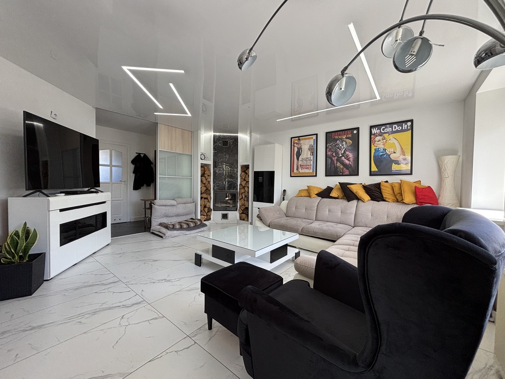 Pokój dzienny z kominkiem i wyjściem na duży, zadaszony balkon. Na podłodze położono gres, ściany wygładzone i pomalowane. Sufit napinany z oświetleniem LED.