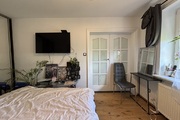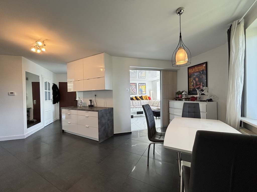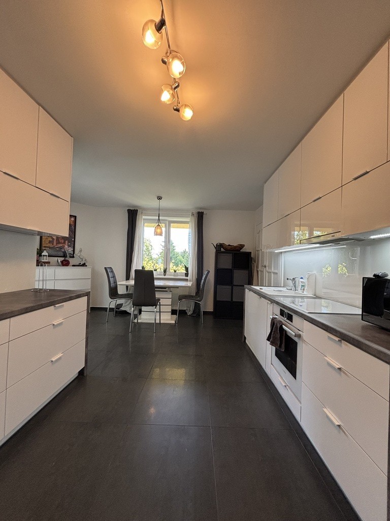 Na wyposażeniu zabudowa kuchenna na wymiar. Wyposażona w sprzęt AGD : zmywarka, płyta indukcyjna, okap, piekarnik, lodówka.
