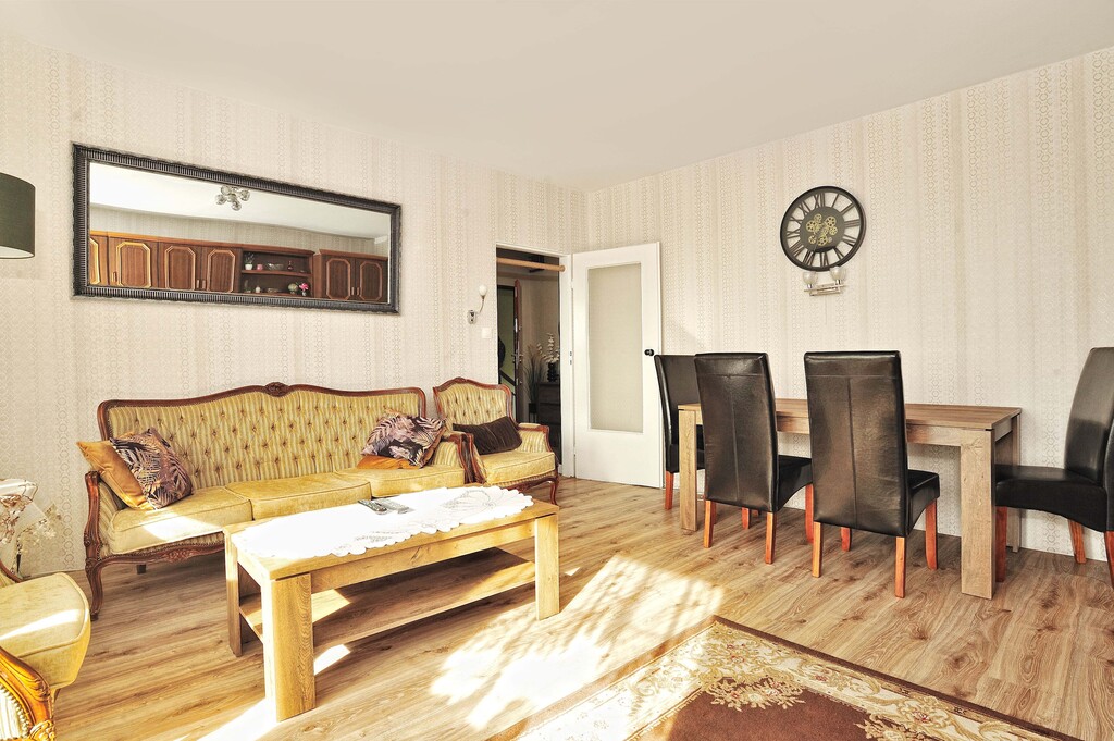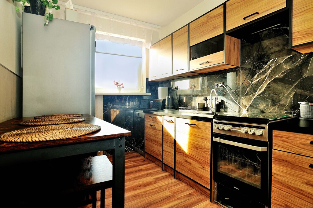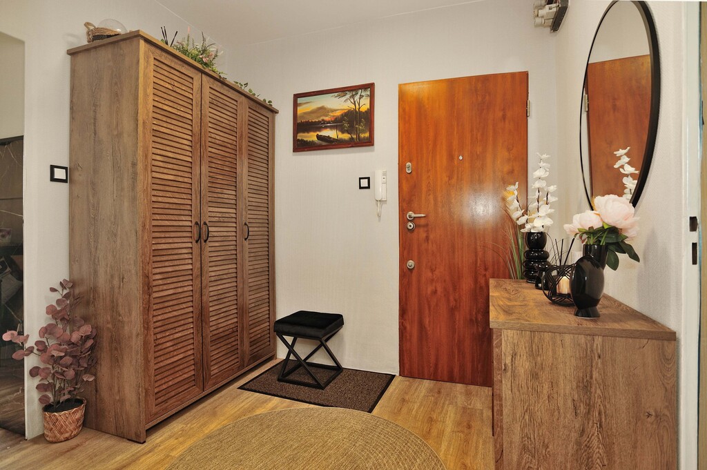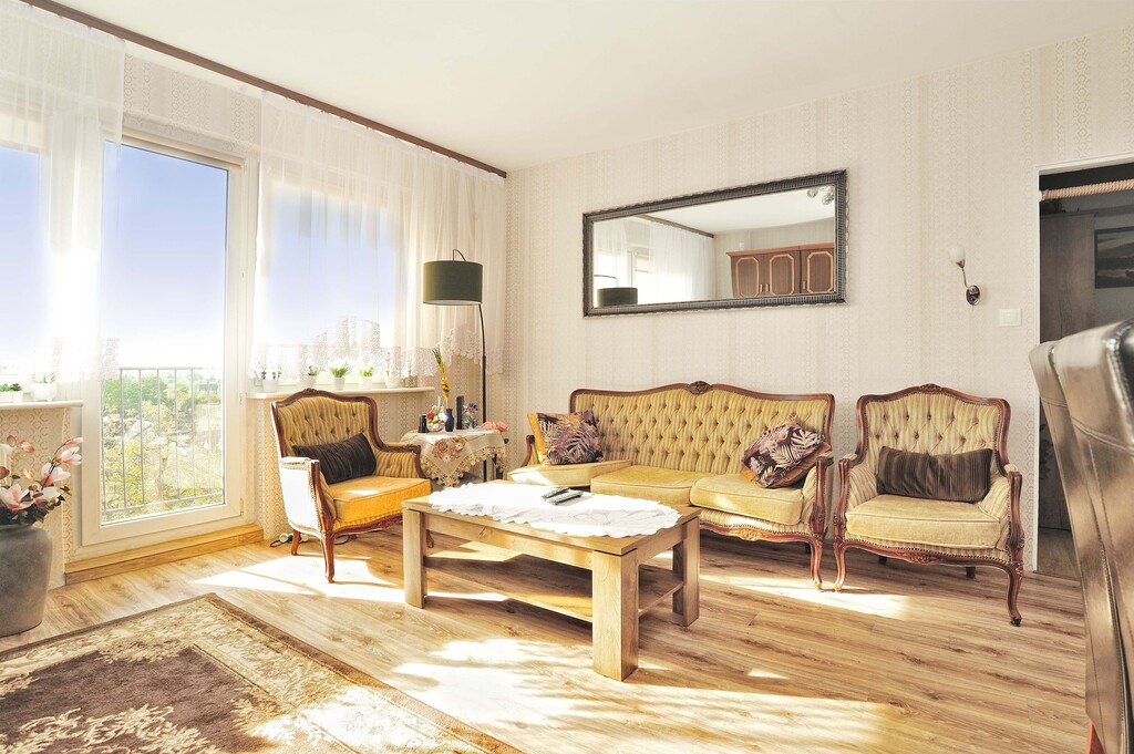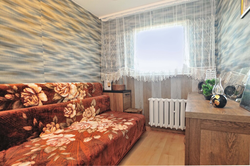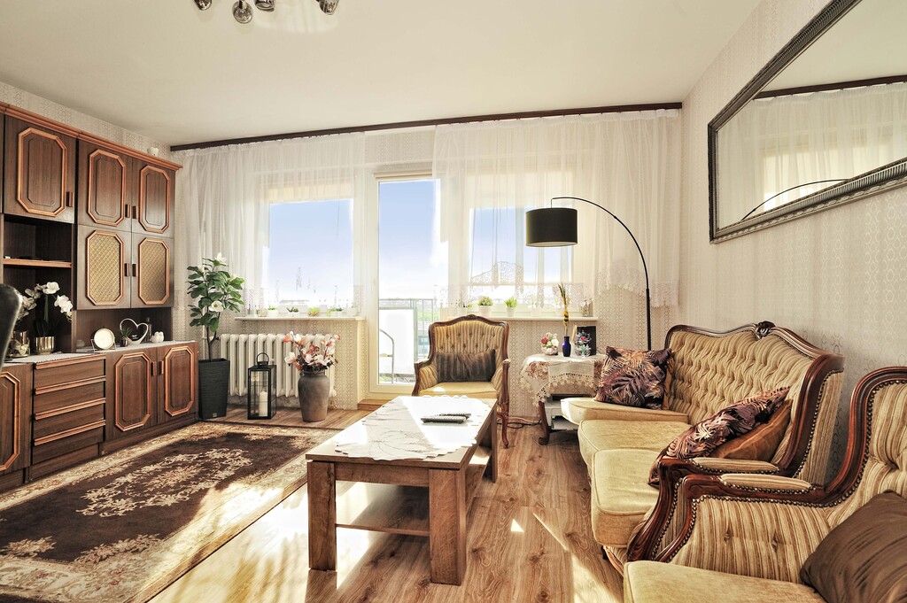 Ściany w każdym z pomieszczeń są jasne, a podłogi wyłożone panelami. Łazienka wyposażona jest w kabinę prysznicową, umywalkę oraz pralkę. Dodatkowo wykończona płytkami drewnopodobnymi, w takim samym stylu jest wykończone WC. Kuchnia dodatkowo jest wykończona płytkami imitującymi czarny marmur, jest w pełni umeblowana. Wyposażona jest w lodówkę, kuchenkę gazową, wraz z piekarnikiem, zmywarkę oraz zlewozmywak. W kuchni znajduje się, również stolik z dwoma krzesłami (meble kuchenne i sprzęty są w cenie mieszkania). Pokoje wyposażone są w meble, jeden z nich posiada pokaźnych rozmiarów łóżko, a drugi kanapę z opcją rozłożenia. Salon jest największym pomieszczeniem w mieszkaniu, wyposażony jest w sporą meblościankę, sofa oraz fotele w retro stylu, wraz z stolikiem kawowym. W salonie jest wydzielone miejsce jadalniane, w którym znajduje się stół z 4 krzesłami. Z danego pomieszczenia jest wyjście na balkon. W przedpokój znajduje się spora szafa oraz szafka na buty (meble i sprzęty znajdujące się w pokojach, łazience, przedpokoju oraz WC, są poza ceną mieszkania, do uzgodnienia z właścicielem).