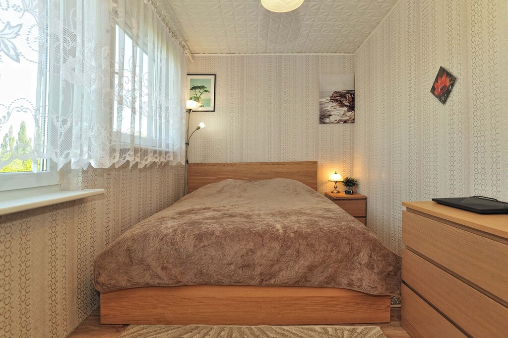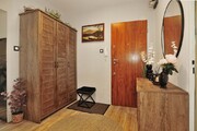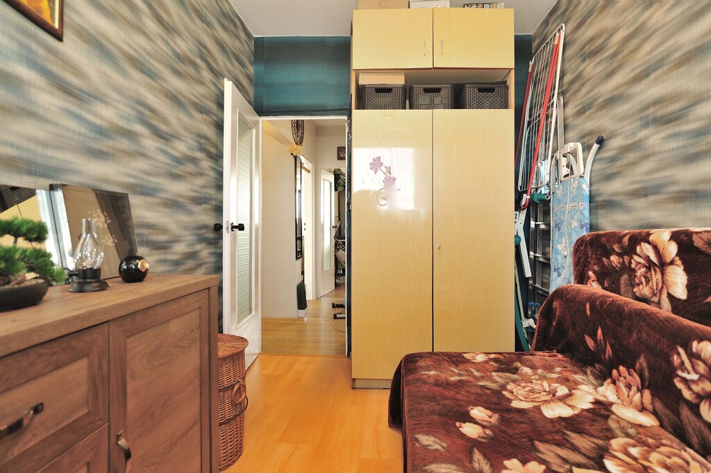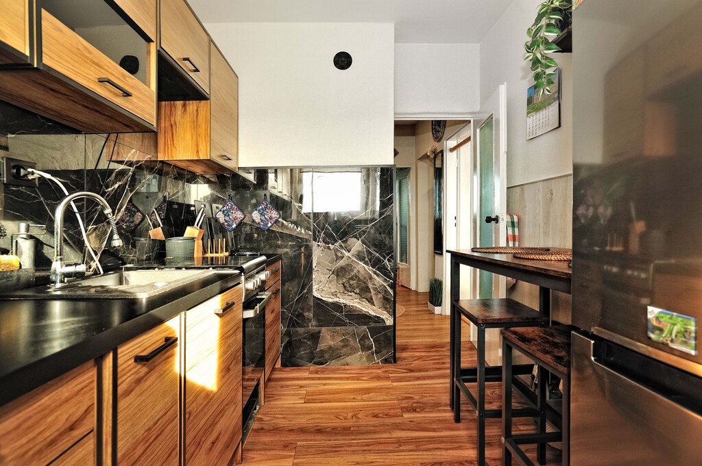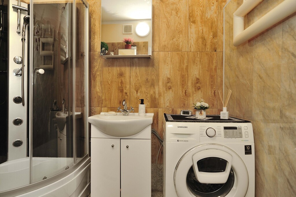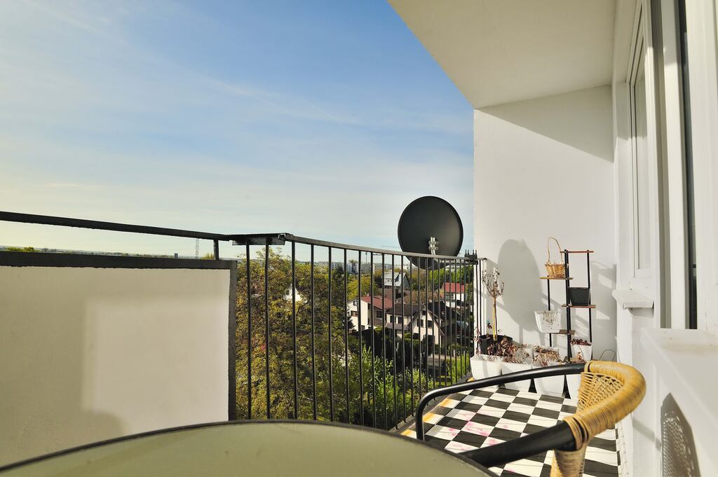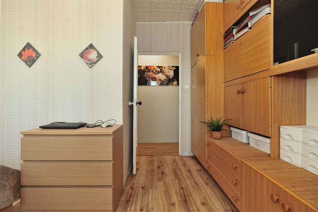 Ściany w każdym z pomieszczeń są jasne, a podłogi wyłożone panelami. Łazienka wyposażona jest w kabinę prysznicową, umywalkę oraz pralkę. Dodatkowo wykończona płytkami drewnopodobnymi, w takim samym stylu jest wykończone WC. Kuchnia dodatkowo jest wykończona płytkami imitującymi czarny marmur, jest w pełni umeblowana. Wyposażona jest w lodówkę, kuchenkę gazową, wraz z piekarnikiem, zmywarkę oraz zlewozmywak. W kuchni znajduje się, również stolik z dwoma krzesłami (meble kuchenne i sprzęty są w cenie mieszkania). Pokoje wyposażone są w meble, jeden z nich posiada pokaźnych rozmiarów łóżko, a drugi kanapę z opcją rozłożenia. Salon jest największym pomieszczeniem w mieszkaniu, wyposażony jest w sporą meblościankę, sofa oraz fotele w retro stylu, wraz z stolikiem kawowym. W salonie jest wydzielone miejsce jadalniane, w którym znajduje się stół z 4 krzesłami. Z danego pomieszczenia jest wyjście na balkon. W przedpokój znajduje się spora szafa oraz szafka na buty (meble i sprzęty znajdujące się w pokojach, łazience, przedpokoju oraz WC, są poza ceną mieszkania, do uzgodnienia z właścicielem).