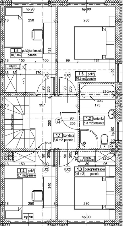 – 4 pokoje: 10,9 m2 10,6 m2 9,5 m2 i 8,1 m2