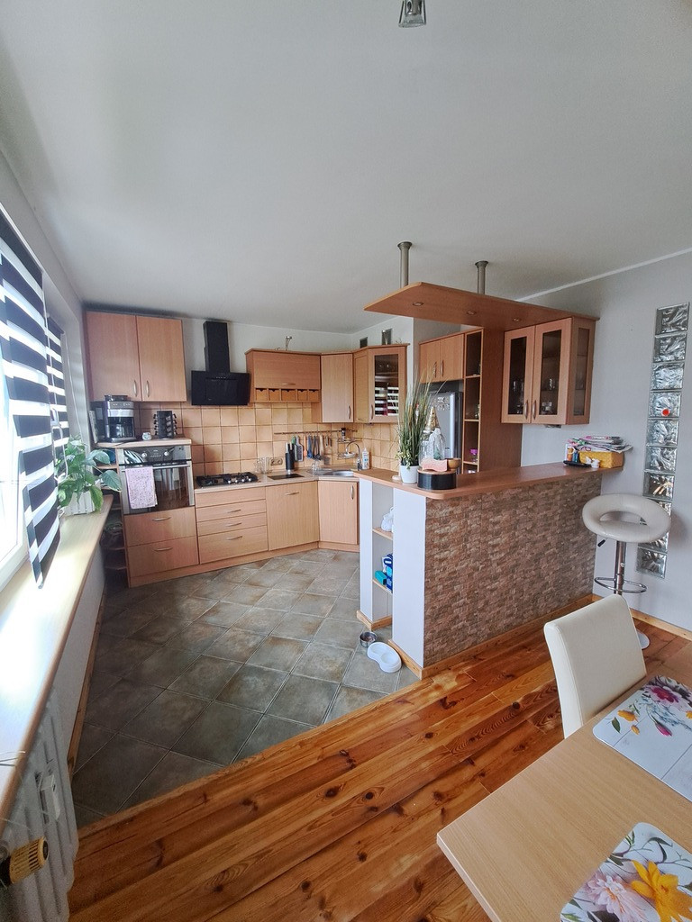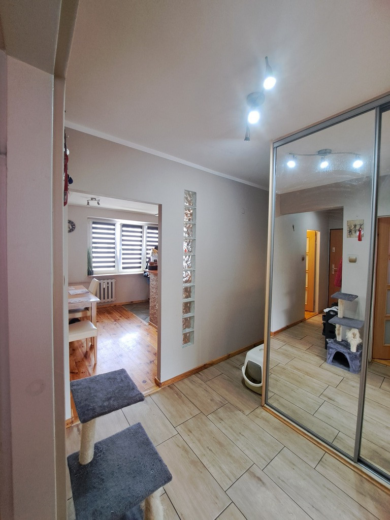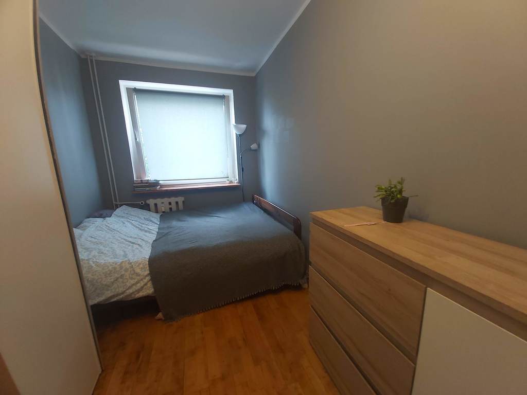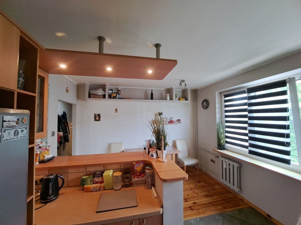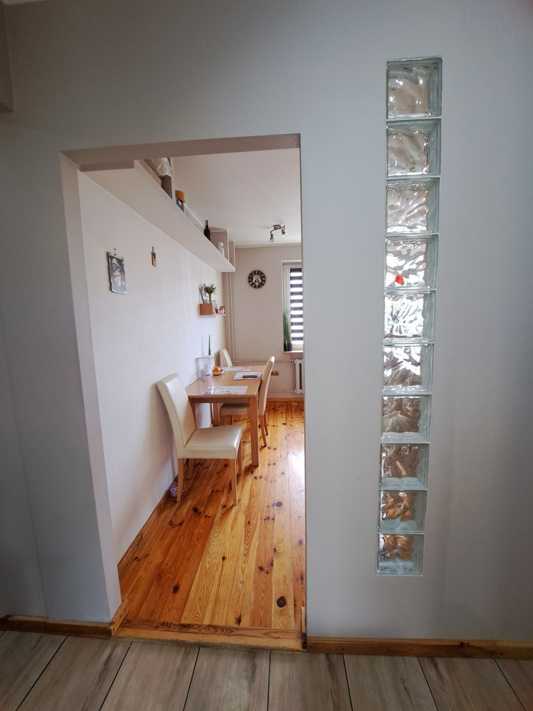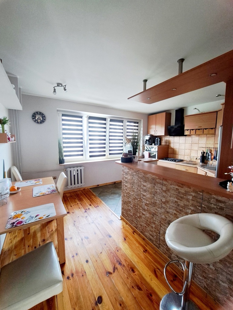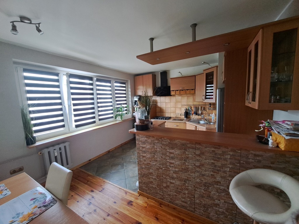 Mieszkanie pierwotnie czteropokojowe, obecnie po połączeniu kuchni z przyległym pokojem powstała duża kuchnia z jadalnią ponadto pokój dzienny, dwie sypialnie, łazienka, toaleta oraz przestronny wygodny przedpokój.