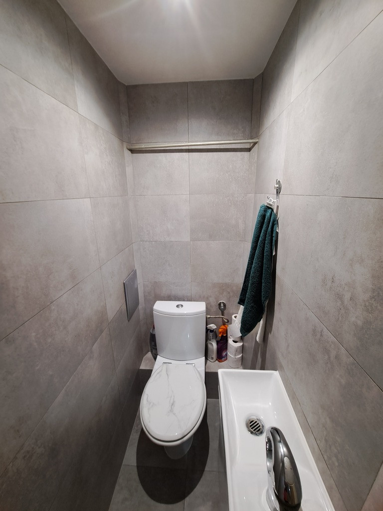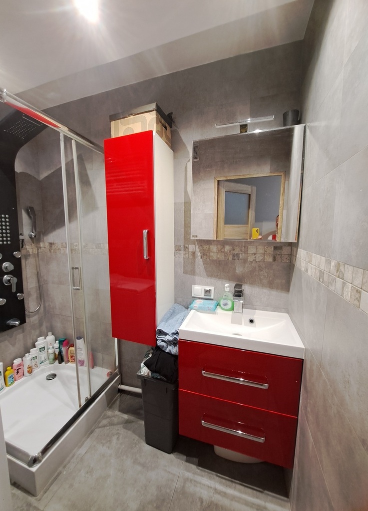 Łazienka po remoncie z kabiną prysznicową.