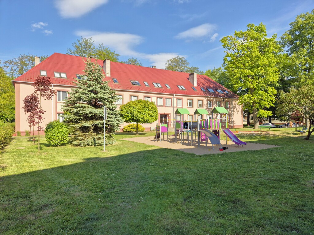 * niski 2 piętrowy budynek (3 kondygnacje) po termomodernizacji