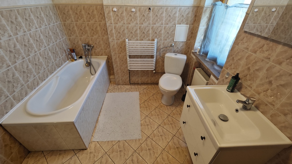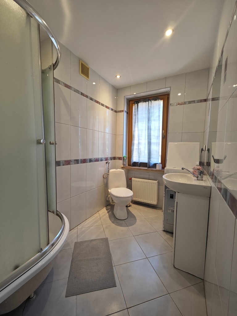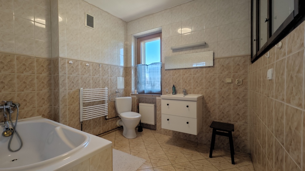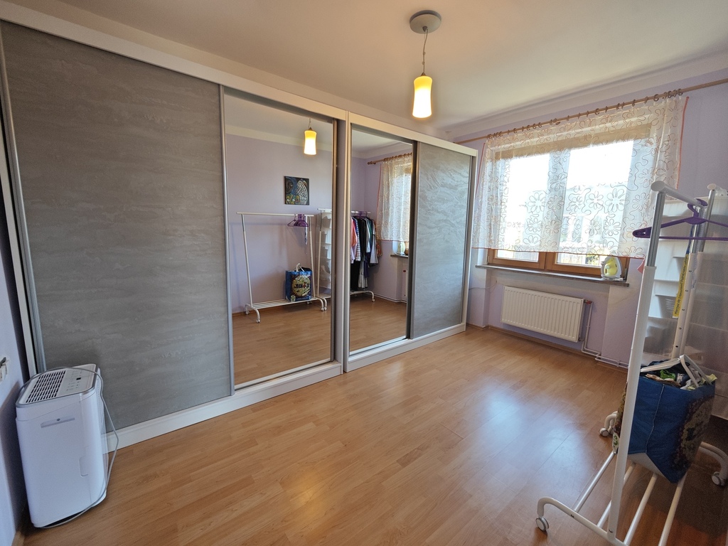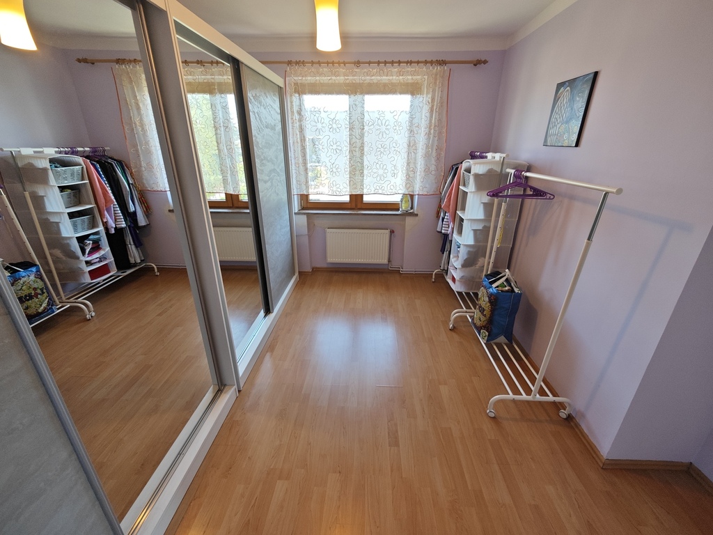 Na parterze znajduje się bardzo duży salon o powierzchni ponad 32m2 z wyjściem na taras (możliwość wykonania zejścia na ogród), osobno kuchnia 11m2 z oknem, łazienka 4m2 również z oknem, hol oraz wiatrołap. Istnieje możliwość podzielenia salonu na dwa niezależne pokoje uzyskując w ten sposób piąty pokój (np. pomniejszając salon z 32m2 do 22m2 uzyskujemy dodatkowy gabinet o powierzchni 10m2). Na górny poziom prowadzą wygodne schody (wylewka betonowa plus stopnie wykończone drewnem). Piętro to trzy niezależne pokoje (największy ponad 19m2 z wyjściem na balkon plus dwa pokoje po 12m2), kolejna łazienka prawie 6m2 z oknem oraz hol 5m2 z wyjściem na kolejny balkon. Poziom piwnicy to przede wszystkim duży garaż z nową, automatyczną bramą (łagodny zjazd do garażu), pomieszczenie z piecem gazowym II-obiegowym firmy Junkers, pomieszczenie gospodarcze oraz pomieszczenie od strony ogrodu z bezpośrednim wyjściem na ogród, gdzie właściciele przechowują narzędzia do konserwacji ogrodu (między innymi kosiarkę do trawy).