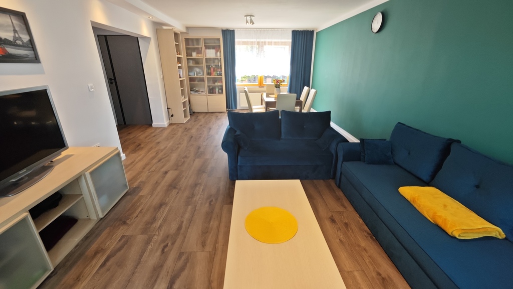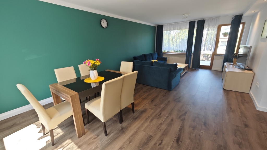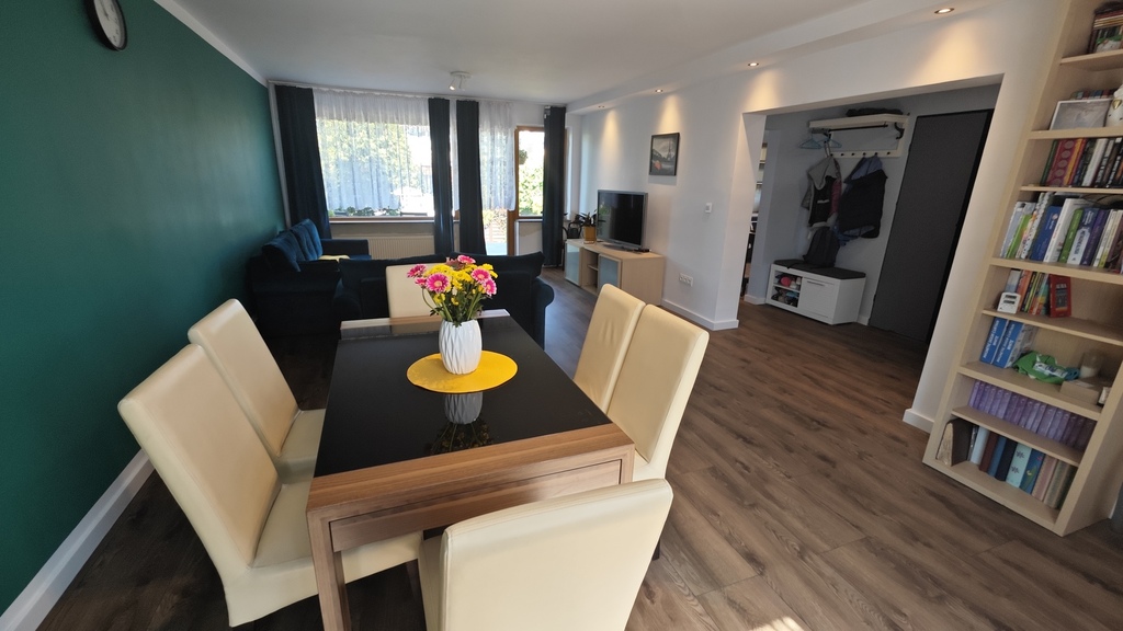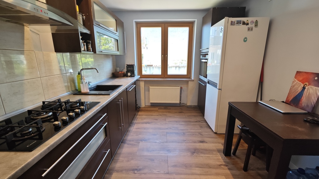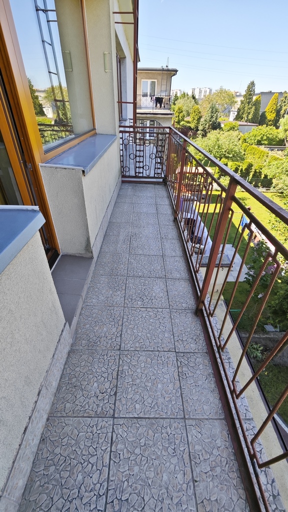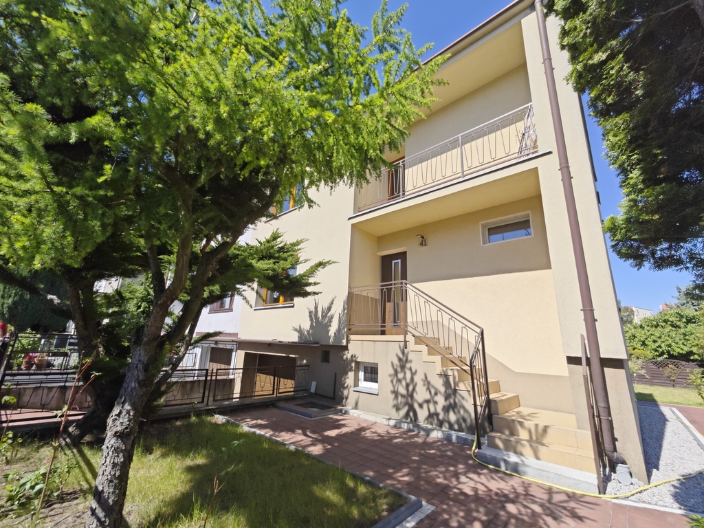 Na parterze znajduje się bardzo duży salon o powierzchni ponad 32m2 z wyjściem na taras (możliwość wykonania zejścia na ogród), osobno kuchnia 11m2 z oknem, łazienka 4m2 również z oknem, hol oraz wiatrołap. Istnieje możliwość podzielenia salonu na dwa niezależne pokoje uzyskując w ten sposób piąty pokój (np. pomniejszając salon z 32m2 do 22m2 uzyskujemy dodatkowy gabinet o powierzchni 10m2). Na górny poziom prowadzą wygodne schody (wylewka betonowa plus stopnie wykończone drewnem). Piętro to trzy niezależne pokoje (największy ponad 19m2 z wyjściem na balkon plus dwa pokoje po 12m2), kolejna łazienka prawie 6m2 z oknem oraz hol 5m2 z wyjściem na kolejny balkon. Poziom piwnicy to przede wszystkim duży garaż z nową, automatyczną bramą (łagodny zjazd do garażu), pomieszczenie z piecem gazowym II-obiegowym firmy Junkers, pomieszczenie gospodarcze oraz pomieszczenie od strony ogrodu z bezpośrednim wyjściem na ogród, gdzie właściciele przechowują narzędzia do konserwacji ogrodu (między innymi kosiarkę do trawy).