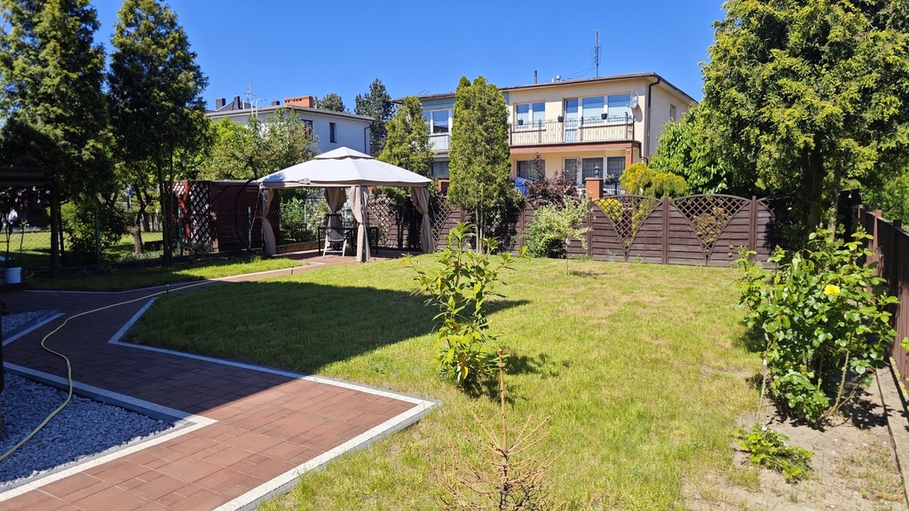 Niewątpliwym atutem nieruchomości jest ładnie zagospodarowany ogród (mniejsza część znajduje się od strony ulicy, zaś główny ogród znajduje się na tyłach nieruchomości). Ogród jest przede wszystkim pokryty ładnie utrzymanym trawnikiem z alejkami wyłożonymi polbrukiem plus nieliczne drzewka (wierzba oraz dwie wiśnie) i dodatkowo miejsce do wypoczynku pod rozstawianym namiotem. Ogródek jest bardzo słoneczny. Poza garażem w bryle budynku – na posesję można wjechać przez drugą bramę wjazdową, aby zaparkować dwa kolejne samochody (przed posesją kolejne dwa miejsca postojowe).