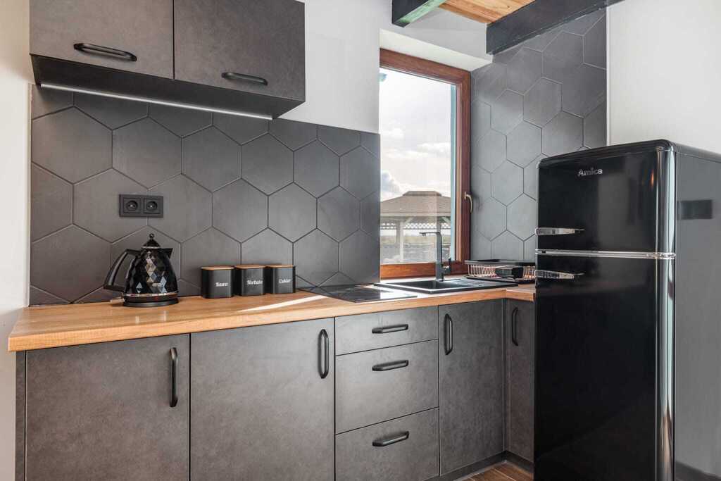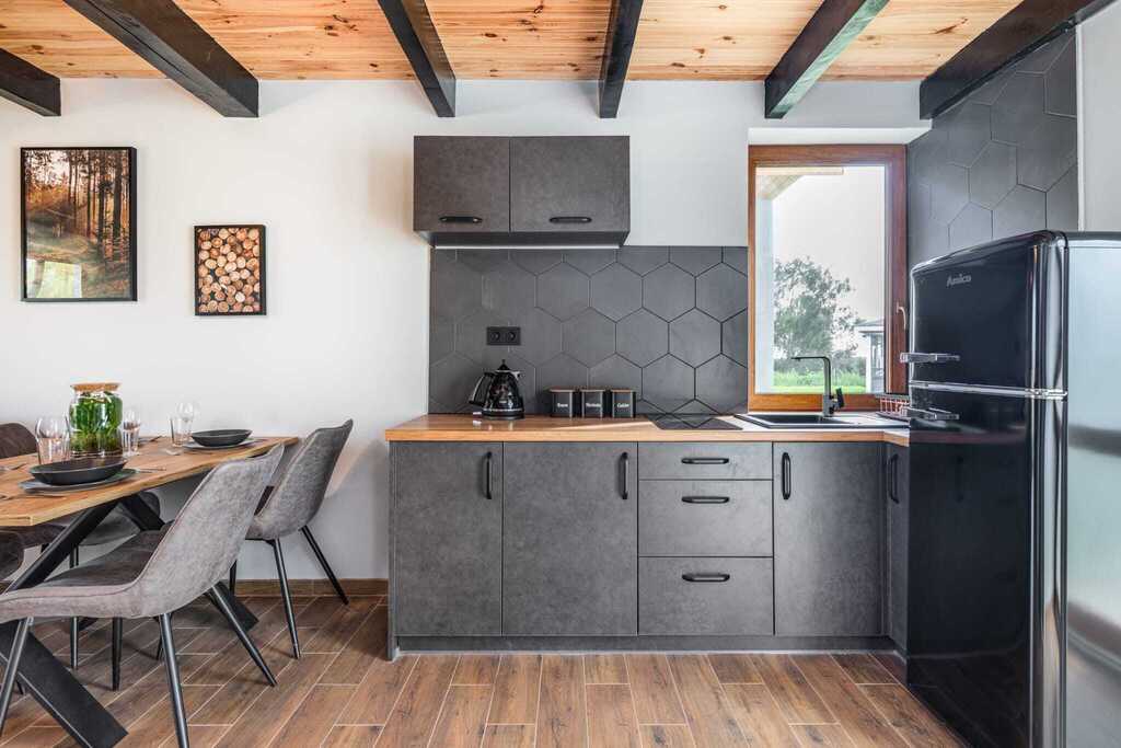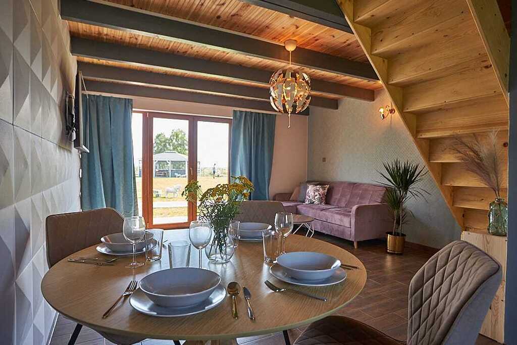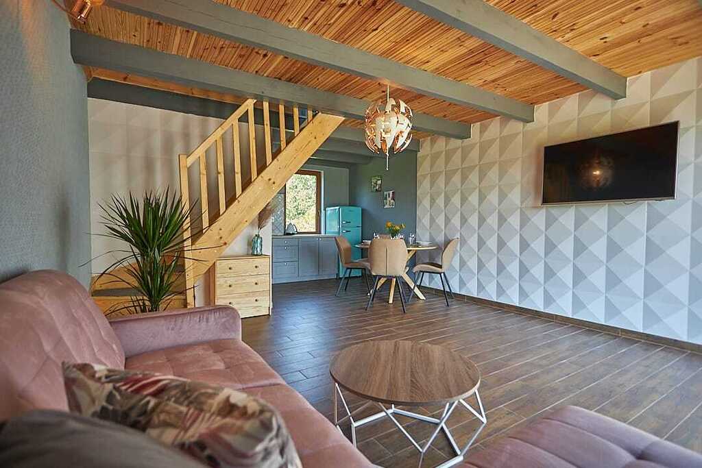 - Parter: otwarta przestrzeń dzienna z kuchnią, częścią jadalną i wypoczynkową oraz łazienka z kabiną prysznicową. Rozkładana sofa pozwala na zakwaterowanie dodatkowych osób