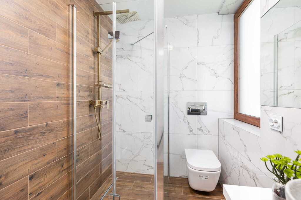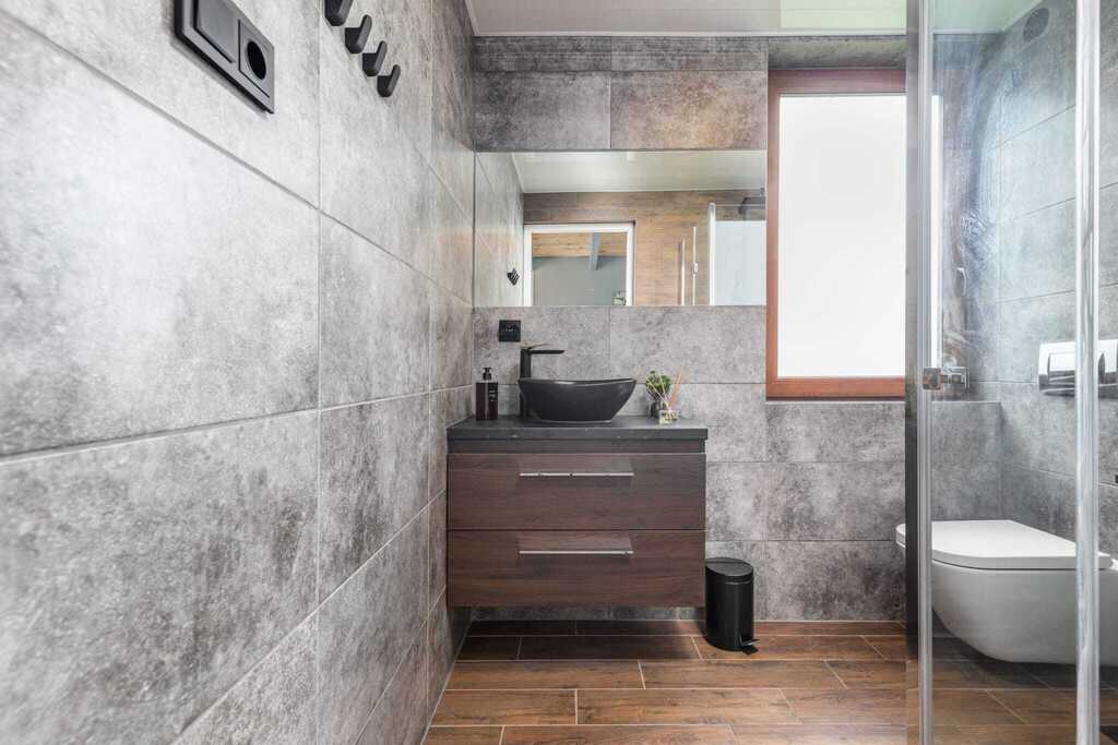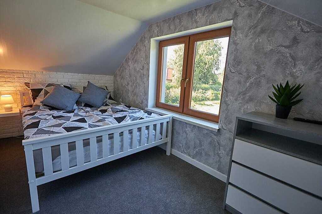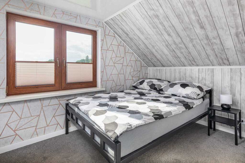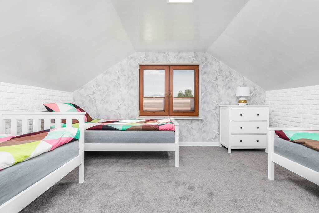- Piętro: dwie oddzielne sypialnie – jedna przystosowana dla trzech osób, druga dla dwóch. Maksymalna liczba gości w jednym domku to siedem.