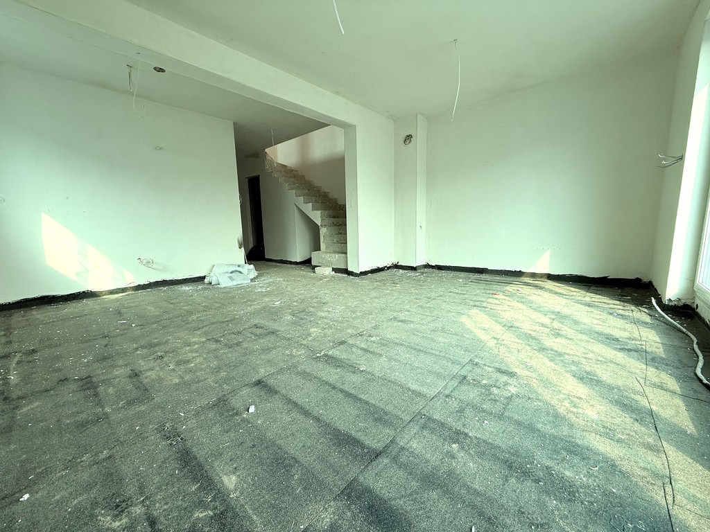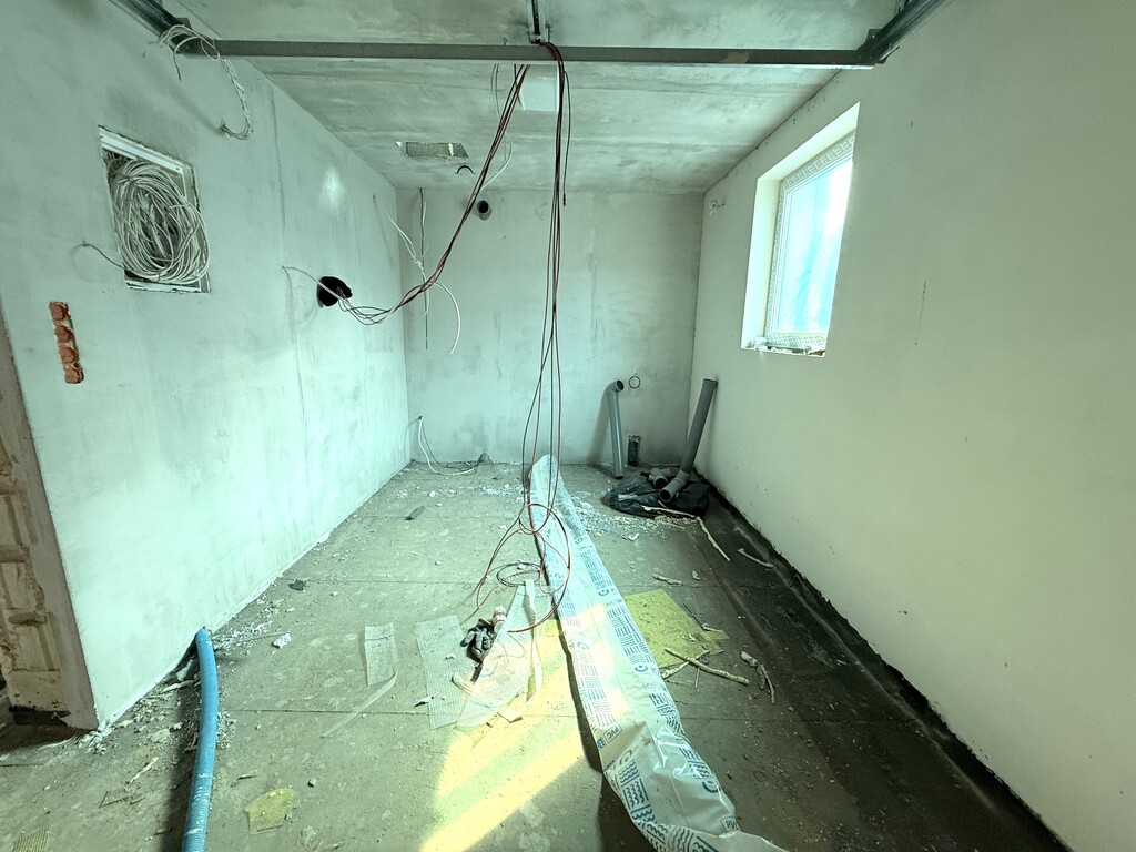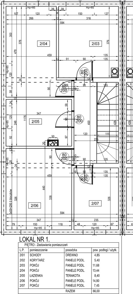 Parter: salon z aneksem kuchennym, przedsionek, łazienka oraz garaż. Na piętrze: cztery pokoje, łazienka, korytarz.
