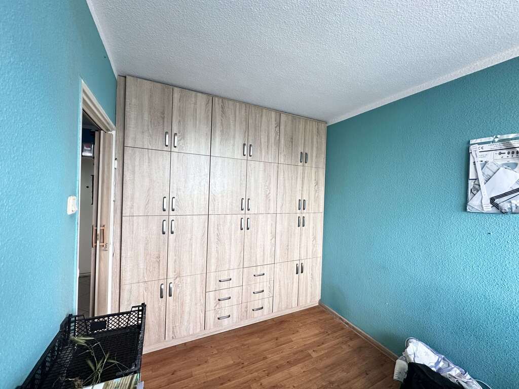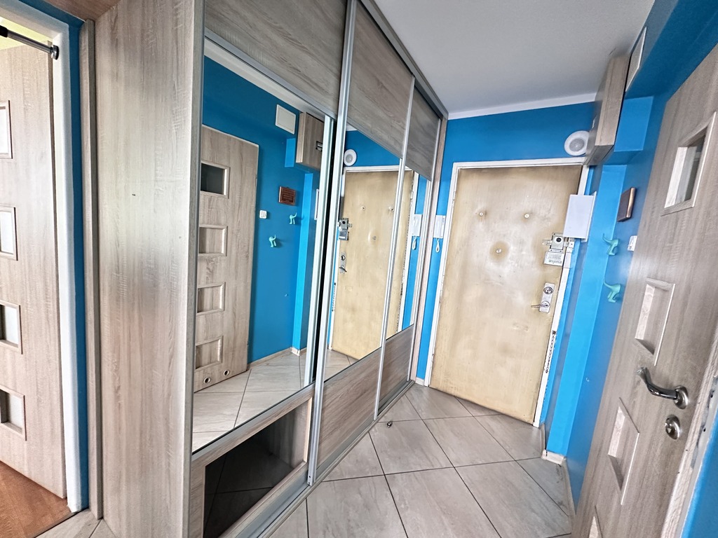 W małym pokoju zabudowa na całej ścianie- zamykane szafki z półkami, w przedpokoju szafa z przesuwanymi drzwiami i pawlacz.