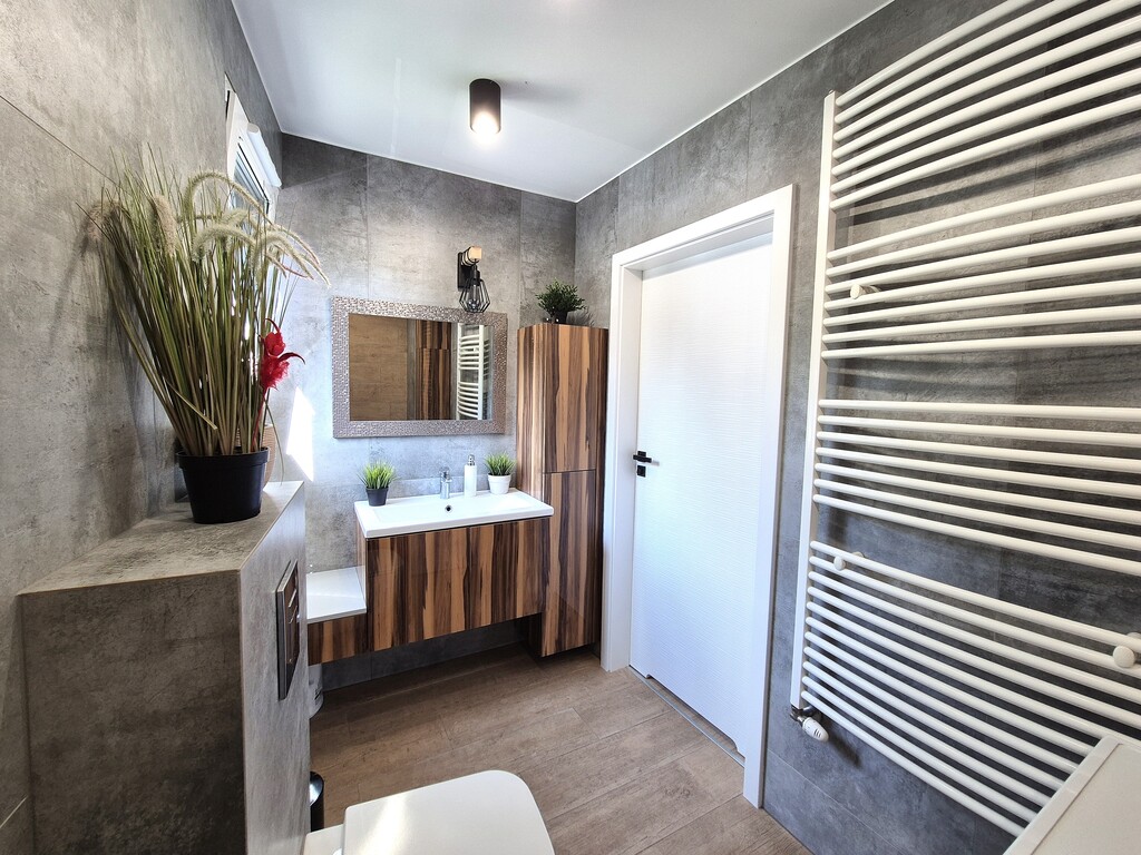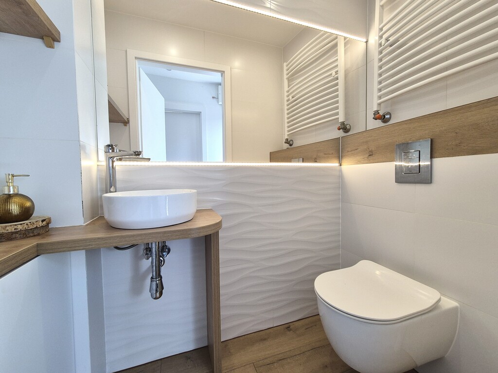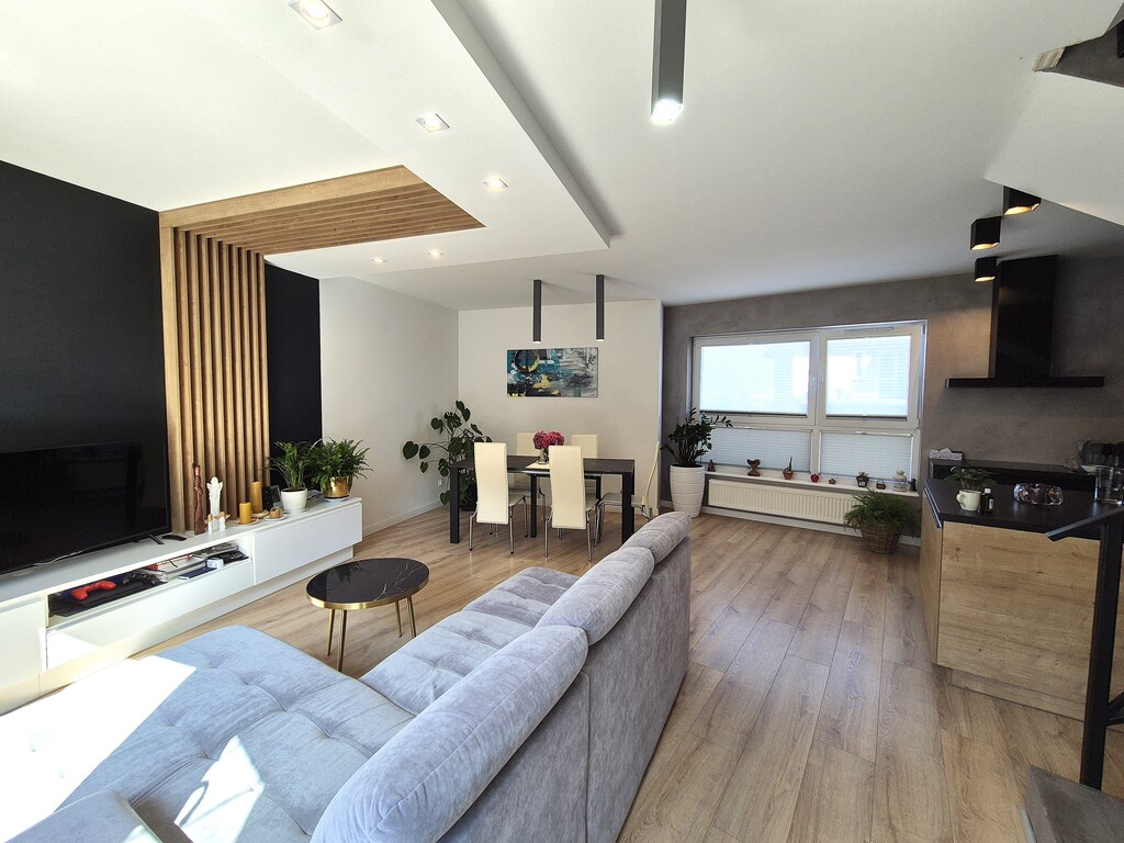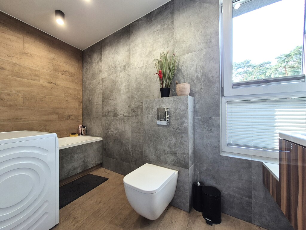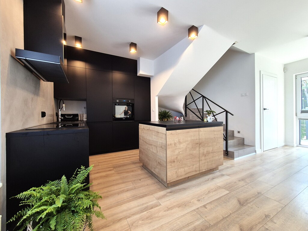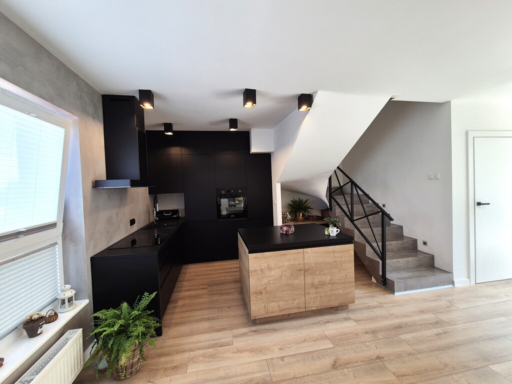 W cenie nieruchomości liczne stałe zabudowy. Kuchnia wyposażona w sprzęt AGD oraz piękna wewnętrzna stolarka drzwiowa i niestandardowe wykończenie ścian betonem wysokiej jakości.