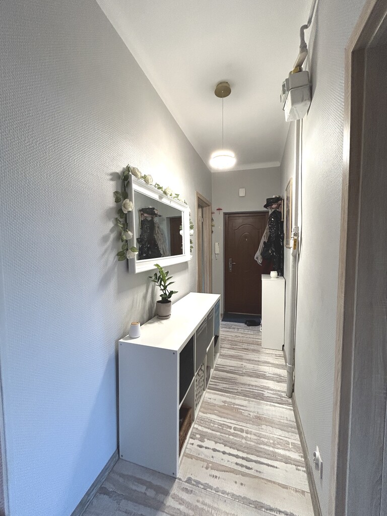 Na podłogach panele, na ścianach tapety. W kuchni również panele. Łazienka w glazurze.